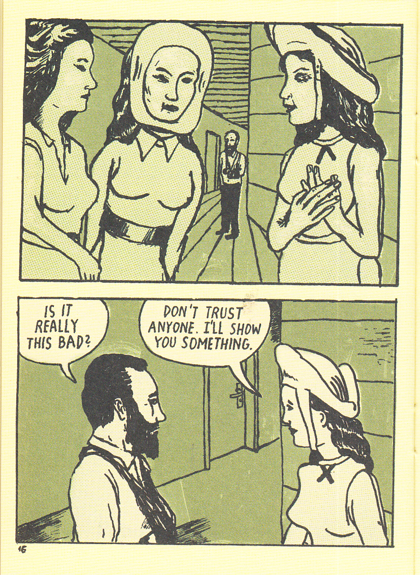 OK, it’s almost certainly cheating to put the synopsis on here from the back of the comic, but I just can’t resist. So: “This No Place To Stay is a semi-fictional, semi-biographical story by the German artist Michael jordan. His bearded alter ego travels through a coffee cup into a labyrinth inside a hospital laboratory. Hopefully the wound in the nurse’s hand can rescue him…” And no, those ellipses are not me letting the synopsis trail off, that’s just how they ended it. Why put the entire thing in the review? Because I couldn’t have put it better myself, and because it raises many more questions than it answers. Things start off with our bearded hero (and I am dying to know which parts of this are biographical) going up a long staircase to enter a cave/mountain wall/waiting room. From here he is meant to be processed, but is told to wait in the cafe, where he sees other sleeping people, is told that sleeping is not allowed, and wakes up in a hospital with his arm in a sling. From here we see the creepy people in charge of the hospital, the nurse who wants to help (it also features a few nurses who see no point in helping), and our hero’s eventual attempt at escape. The whole thing is delightfully surreal and more than a little claustrophobic. No, I’m not sure how that happens in a comic with plenty of wide open spaces either, but trust me, that’s what I was feeling. It’s gorgeous, it’s haunting and I’m not entirely sure what to make of it. Sounds like the perfect comic to me! $6