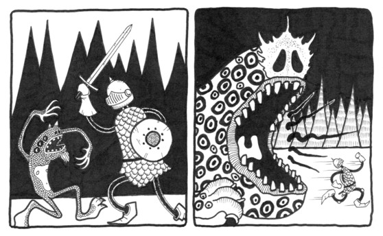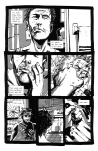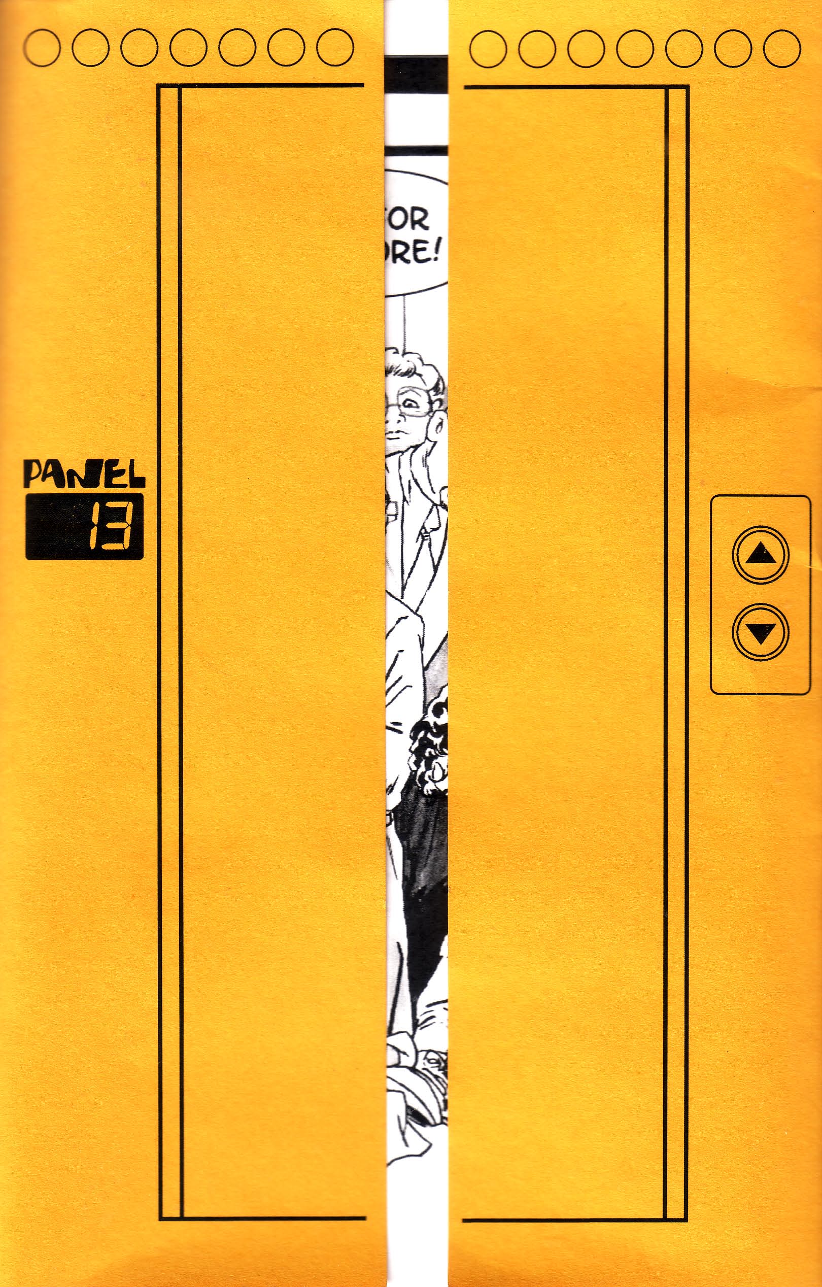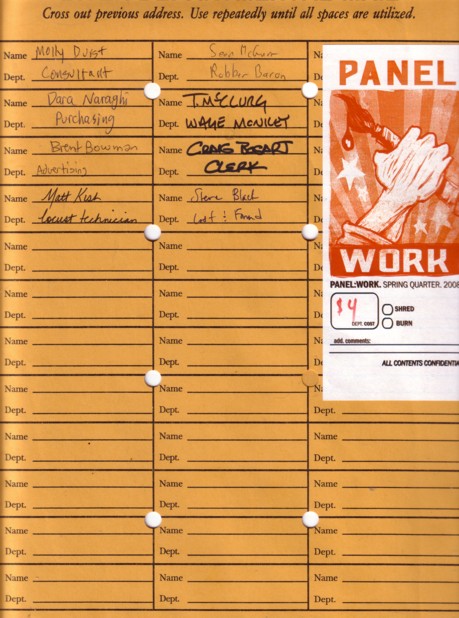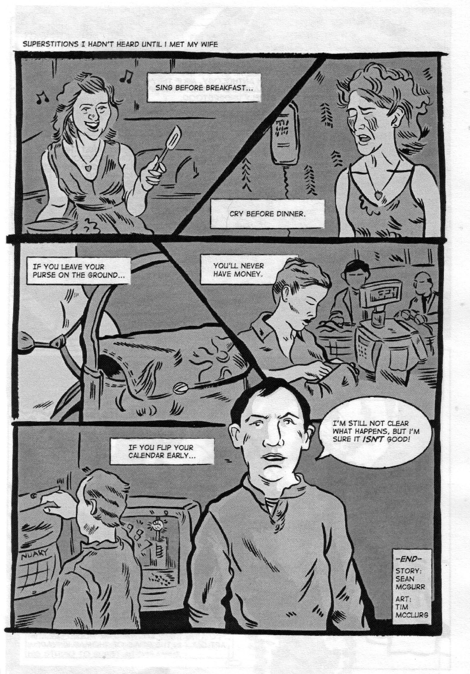 It’s difficult to tell from that cover scan, but this comic comes in a DVD case. Yep, the Panel folks keep stepping up their game, threatening to finally quit fooling around and design an anthology that is utterly perfect, negating the need for anybody to try again. Of course, if they ever do get there I’ll be the last person to point it out to them, because if I did they might stop putting out anthologies, and nobody who likes comics wants that to happen. So, right off the bat, the DVD case. That cover is pretty great (I particularly enjoyed the “Special Appearance” blurb followed by a couple of new names) but the back cover is pretty sweet too, featuring panels from the comics and a nice synopsis. It houses a regular comic, not some strange hybrid of the two, so don’t be alarmed. The “Chapter Selections” are neatly laid out on this back cover and the bios of all the artists and writers is again a high point. Fine, isn’t there a comic in here? Yep, and it’s over 60 pages at $5, which makes it very cheap considering all the bells and whistles. Well, I guess the only expensive bell and/or whistle would be the DVD case, and they probably found them in a landmine somewhere, as all DVD cases will outlast us multiple times over. Still, kudos. Highlights? There’s Brent Bowman with movie posters for theoretical movies that never got made (oh, to live in the universe where Kubrick directed “Lord of the Rings”), Sean McGurr & Tim McClurg with a simple but accurate description of the many assholes you’ll run into at a theater these days, Craig Bogart remaking an old Panel story by Andy Bennett, Dara Naraghi & Dan Barlow going through the excruciating process of making their own movie (and the hilarious premiere night), Tony Goins coming to the logical conclusion that you’d be better off just making a comic, Sean McGurr & Brent Bowman telling the story of Sean’s (or maybe Brent’s) fear about terrorists at the Spiderman 2 premiere in 2004 and Ross Hardy with a tale of various Star Wars characters locked in a drunken card game and talking about the films. The Matt Kish pieces were a bit of a highlight, as usual, but odd as they were both written by other people (Dara Naraghi and Sean McGurr respectively), even though they were both explicitly about Matt. The first was his reaction to the awful (hypothetical; we should be so lucky) Spudd 64 adaptation and the second was Matt illustrating some of the classic lines from Star Trek 2, which wouldn’t seem to require much of a writer at all, but what do I know? I think the man is on the right track and that he should immediately start drawing more of his interpretations of famous movie lines, but I’m biased enough to wish that Matt would also draw a running commentary of my life. I left out some pieces for no good reason really, as there wasn’t a terrible piece in the bunch, just a few I enjoyed slightly more than the others. Buy this, why don’t you, these people need to know that what they’re doing is seen far and wide and that people want them to keep it up. $5