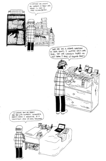 Hey, this isn’t a fart party! It’s OK, I believe Julia is allowed to branch out a bit if she wants. This is an intensive study of brains, Julia’s in particular. It starts with a hilarious two page summary of brains throughout history and why humanity had such a long chunk of time when no scientific study was possible (hint: it involves the bible). My favorite quote out of many good ones: “Around the late 1890’s, fancy tools like the microscope were developed, making brain studies much more sophisticated than just cutting that shit open and poking around the mess.” Then we get to the regular comic, which opens with Dr. Watson (who is apparently a tiny, tiny man) and Sherlock Holmes hoping to study Julia’s brain. Sadly, the brain has left the building (and I absolutely love the fact that Julia’s cartoon head, when popped open, makes a “boing” noise), so the two detectives have to figure out Julia’s life from her apartment and belongings. They conclude that Julia’s brain has helped and hurt her plenty over the years, but I’m done describing the contents here as any more will just cheat you out of this pile of comic goodness. I like the new direction, even though it’s not a whole lot different from the fart party stuff. I also may be one of the few who hopes she takes one of her fake future subjects listed at the back of the book and makes it into a comic. “Why On Earth Did You Ever Think That’d Be A Good Idea?” has all kinds of potential. No price listed, but I’m guessing $2.50 just for the hell of it.