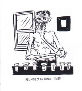 Anybody else getting a serious “Bride of Frankenstein” vibe off of that cover? No? Just me, then. It’s actually a clever use of a giant pill behind one of the geniuses mentioned in that title. This is the story of two junkies that Brian has known over the course of his life and how easily they outsmarted everybody around them. First up is the local neighborhood junkie who is always asking people if they need help with any yardwork. That’s fairly common, and Brian was convinced that the guy was casing houses to rob later. It turns out that the guy was a little smarter than that, but why spoil it for you? Pretend to have a junkie brain and try to imagine what you would actually be up to with that scheme. He also relates the story of a girl he knew in school who used to make money babysitting various kids around the neighborhood. Her scheme may have been a bit more obvious than the other junkie, but I’ll bet you can figure out that one too if you think about it. As far as I can tell neither of them ever got caught with these schemes, or if they did Brian never heard about it, hence the title of the comic. Check it you, get some tips on how to be the best junkie you can be! $1