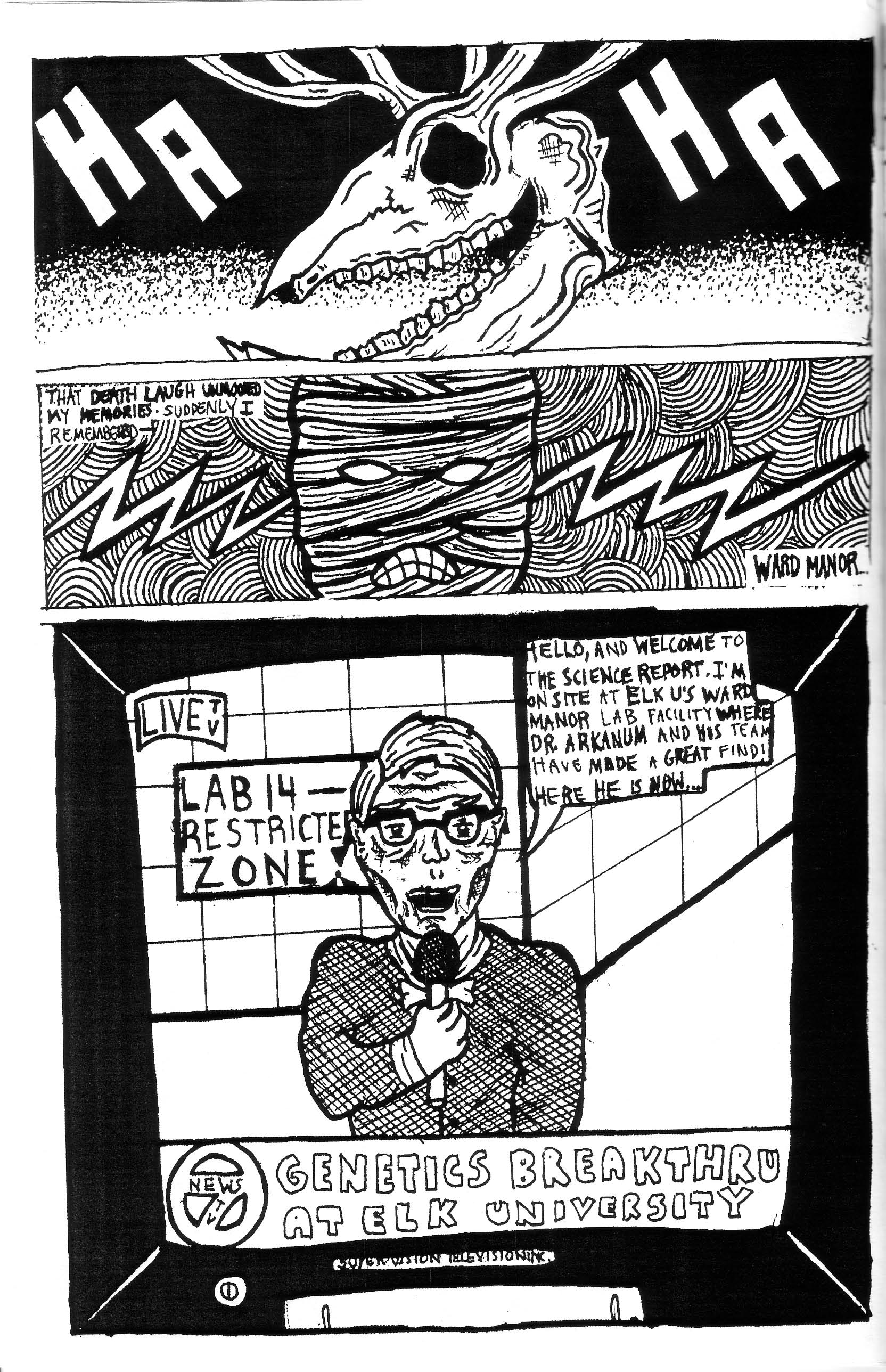 It seems oddly fitting that I picked this comic to review on the nine year anniversary of the site, as there is no contact information readily available for anybody involved and it is the first zine Brian has put together. Hey, that’s what the site is there for, to point people in the direction of comics they wouldn’t otherwise find! The trouble with this one is obvious: there is nowhere to point them. I get the impression that Brian and the other people involved are high school students, which makes me an asshole to critique their stories, but I can live with that. How will they learn if somebody like me doesn’t tell them what they’re doing wrong? First, I’ll get the good stuff out of the way: that is one great title. And the idea of a horror anthology will always, always appeal to me, even if most of them seem to fail in the execution. Brian was also smart enough to put the name of the artist for each story clearly at the end of the pieces, something even the “pros” often forget to do. From here it gets dicey, and this is because of the talents of some artists just starting and the various problems in the print. Brian had a lot to say in his story (and I will get to them all individually), but chose to keep the text boxes small and cram all the words into them. This might have left more artwork visible, but it was at the cost of being able to understand the story. When there are at least three panels that I can’t read the lettering, including the final page of the story, you’re making it too tough on the reader. In most cases all he would have had to do was expand the text box into the solid black of the background. Other stories in here suffered from the dreaded uneven copying, and when some of the art on display was so-so as it was, leaving the text too faint to be read or the art too indistinct to be understood is just going to leave the reader feeling cheated. And seriously, no e-mail addresses anywhere? I guess if these are high school kids they might not want their names associated with this, but there has to be SOME method for curious people to buy the book. OK, now that I’ve bashed the process, how about the stories? Rubble by Anthony Wasilewski was an interesting ancient tale of cat gods and curses, but the last two pages were so garbled and/or indistinct that I’m not sure what happened. Tom Bombadil Got Cut by Quinn Murphy didn’t look all that great at times (squiggly lines don’t actually count as a background), but the idea of Tom Bombadil getting kidnapped and killed by Peter Jackson was funny enough to make up for it. The Siamese Twins’ revenge by Lizzie Baur was also interesting, as it dealt with a man who wanted to know about death without dying, and also had some of the best art in the book (except for the bit with the skeleton of the twins running away from Joseph). Wendy Lotterman’s story about Rick Moranis accidentally making babies being born so big that they literally made the mother explode could have been great, or maybe it was terrible, but I’ll never know because the copy was so faint that I couldn’t read some of the many asides that Wendy put into this piece. Ben Long’s piece about Nazism and a golem didn’t make a whole lot of sense, unless maybe the Jewish kid who killed his rabbi was supposed to be Hitler. Brian’s story has the excellent title Mutant M.D. and probably the best art in the book (he did the cover too), but those clumpy text boxes and the fact that he left it “to be continued” made it more than a bit garbled. Walker Tate’s piece about the Murker was the cleanest of the book, but was only one page, so there wasn’t time to do much. There’s also a H.P Lovecraft story, which would probably be illegal in any format other than zines. So, overall, even if you could find this you’d probably be better off giving it a pass. To any of the people involved in the making of this, I can’t state this strongly enough: don’t get discouraged byme. Tighten up some of the technical aspects, work on making sure your stories are crystal clear to the reader, and this review could have gone a different direction. Above all, NEVER let a reviewer talk you out of making comics. Just make them good enough that said reviewer has to eventually eat his/her words…