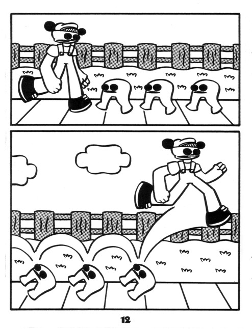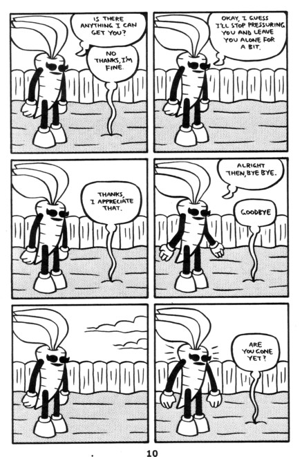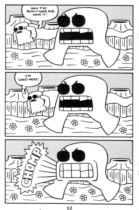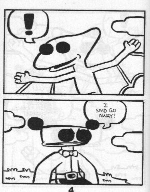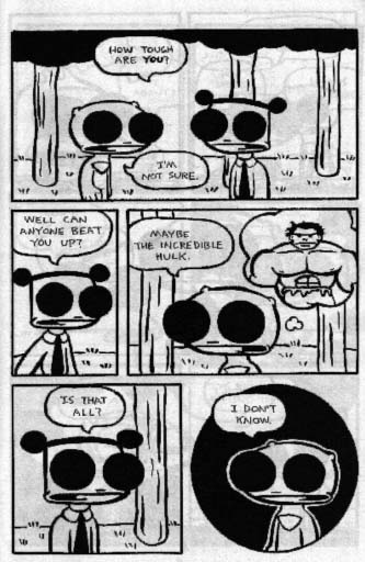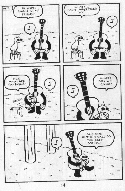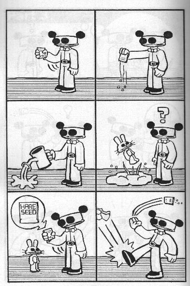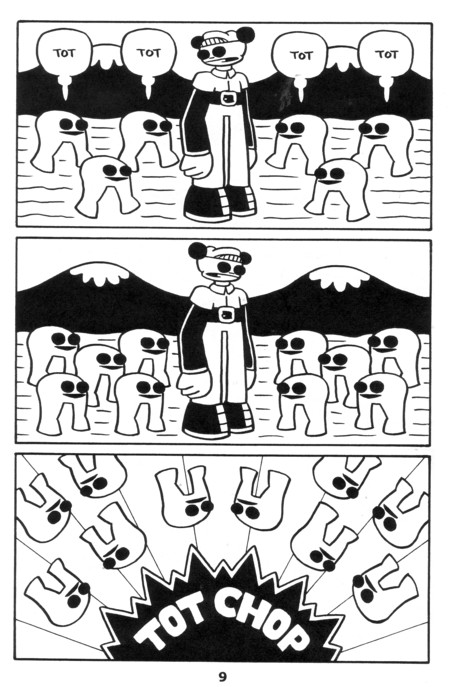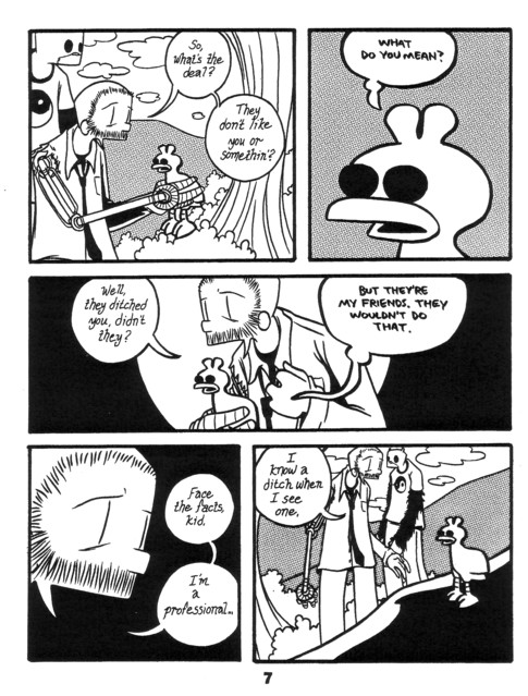 A “talking” guitar who falls in love! A cute rabbit who gets kicked around! Robot! Bird! Giant black eyes! You know, I was going to review every issue, breaking down the finer points, but then I realized that pictures from this incredible series will convince you more than I ever could. You’d think that kicking cute creatures around would get old, but you’d be wrong. I was thinking that this wasn’t one of the better ones and then I remembered the guitar. Pretty much all the stuff I got at SPACE (this and everything after it up to #9) is worth getting. $2