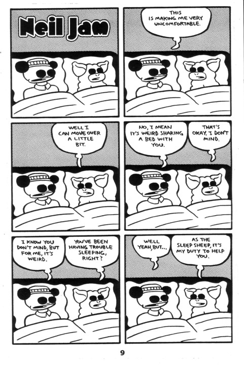 Looks like Neil has mostly gone back to doing the issues himself (see the review for the last issue if you’re lost), which is fine by me. I do think he should keep up with the idea of Neil Jam as a franchise done by other people though. Maybe Neil Jam Jam, a “spinoff”? Anyway, this is another solid issue. The cast of characters seems to be expanding all the time. In here you have the eternal struggle of Willis trying to impress Ona, the other eternal struggle of Jerry trying to get up the nerve to fly, a very insistent little guy called Sleep Sheep, an insulted vegetable, Willis as pimp, a giant adorable bunny-like creature, and another Neil Jam story by Justin Madson. Oh, and a wonderfully fantastic back page featuring versions of Neil from various artists, the best one far and away Kurt Wolfgang’s theory of just what’s behind those giant eyes see. Look, you all know by now that Neil Jam is required reading for decent people everywhere, right? Good. There’s more than enough to convince the stray newcomer out there to check out this issue as their first, but the rest of you should already know all about this comic by now…