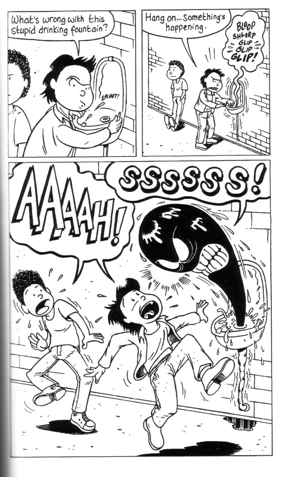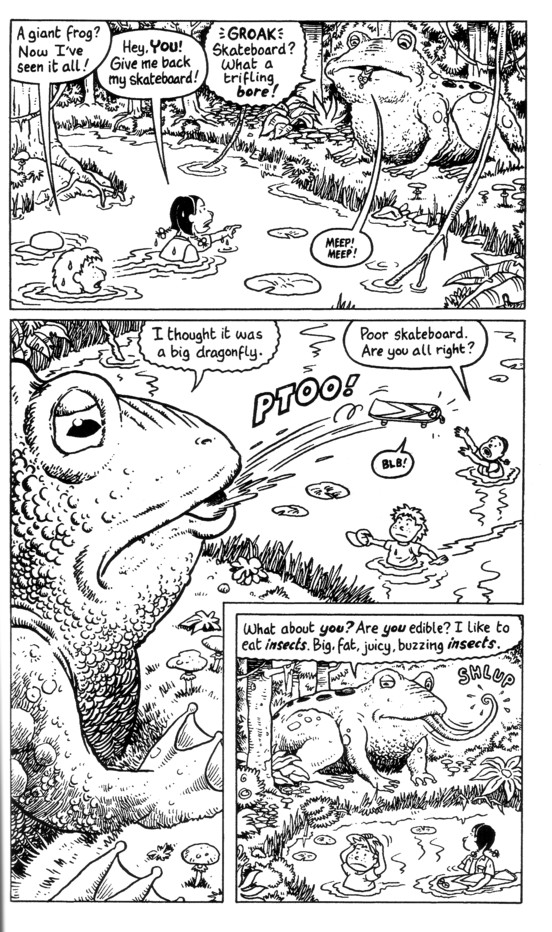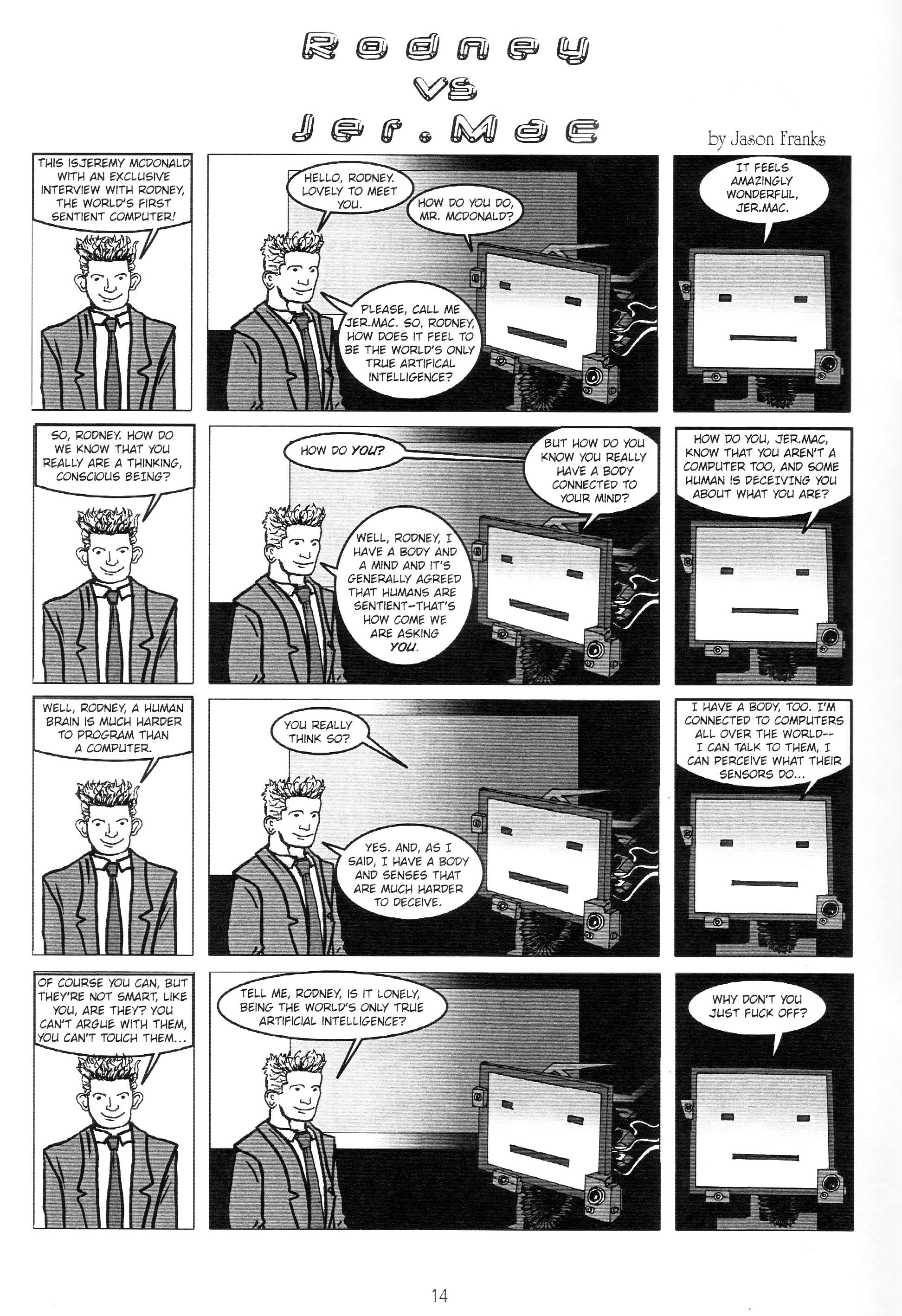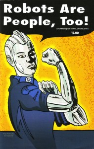 I figured it would be a difficult thing for this comic to live up to that cover, and it managed to pull it off rather easily. Note: I’m just guessing on the number, as Greg sent along other issues of this series as well, but it makes sense to me. So what, this comic is all about robots? Well yeah, what else would you expect from that title? The themes here stay fairly similar, but there’s more than enough variety to satisfy the cynics. Unless you hate robots altogether, or think it’s only a matter of time before they rule us all. Silly people! What makes you think the human race is going to survive long enough to be taken over by robots? Stories in this book of wonders include Let Me Tell You About My Mother by Victor Claudio (a surreal tale with the dialogue being taken entirely from Blade Runner), Great Americans by Lou Copeland (in which the true history of Davy Crockett is revealed), People Are Robots, Too by Steven Mangold (a fascinating text piece about the point at which a machine might reach independent consciousness and what happens next), Android Institute by Jerry Stanford (a parody of the old comic book ads), Rodney vs. Jer. Mac by Jason Franks (in which the horrible sin of clip art is saved by a great punchline), Lonely Robot by Daniel Boyd (a silent piece about, um, a lonely robot), Dick Danger by Fran Matera (a noir thriller about mistaking a femmebot for a woman), Handybot by LaMontagne, Mangold & Wiedemer (possibly the highlight of the book, a fake legal disclaimer detailing all the potential troubles of owning the HandyBot (formerly Destructomat)), some sketchbook pages by a variety of folks (this killed the momentum of the book a bit but they were still interesting sketches), and …Only Flesh and Blood by Greg Vondruskra (in which a robot sort of falls for a human, but does realize that this one will never live to see Halley’s Comet again). I don’t know if this series is still going (this issue came out in 2007), but if it’s not it should be. I would think this would be the sort of thing all sorts of small press folk could get behind if given the chance. Greg’s site leaves that a bit of a mystery, along with whether or not you can get copies from him. Oh well, if you can find it and if you’re a fan of robots, it’s more than worth the effort. $5