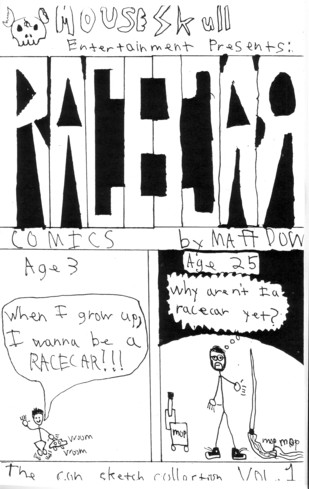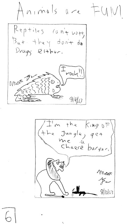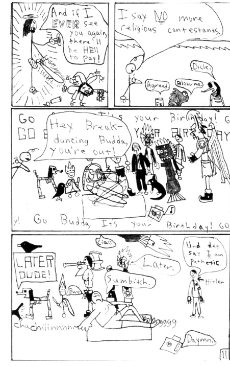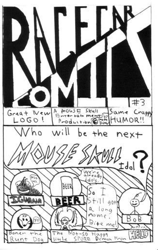 Sketchbook funnies! There, that’s all a bunch of people are going to need to know about this one. It looks like crap (but well-intentioned crap), but it has a good number of funny strips. Matt started doing these at cons to sort of cover for his friend Kelly Howlett while she was doing serious sketches, they got a bit of a following and he decided to put them all in a book for a dollar. Topics include why he’s not an artist, animals, stuff he’ll probably get sued for (mostly parodies of trademarked comic book characters), musical strips, things sure to offend people, and completely random stuff. The musical stuff didn’t do much for me at all, everything else had at least a few funny strips, my favorite being the one about the hamburger. Also on the flip side is two of Matt’s characters (he has another comic coming soon), Iguana and Beer, stumbling across the corpse of Cerebus at the end of that series. He got Dave Sim to go along with it, but it’s a pointless little story. Still, what better place for a pointless little story about one of your favorite comic people than your very own mini comic? Can’t begrudge the man that, and it’s probably cute to the super duper Cerebus fans. Personally I still haven’t finished the series (I’m at about #275, not that that has anything to do with anything), but it was one of those formative things that led me into all these other small press comics, so there will always be more than a little love there for me. And what did that have to do with anything? Oh well. Matt also spent a fair amount of time in the back of the book trying to figure out what he forgot, and I figured it out: contact information! He left it for his friend Kelly Howlett (www.kellyhowlett.com) so just check out her stuff instead, I guess… $1