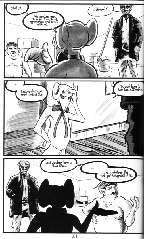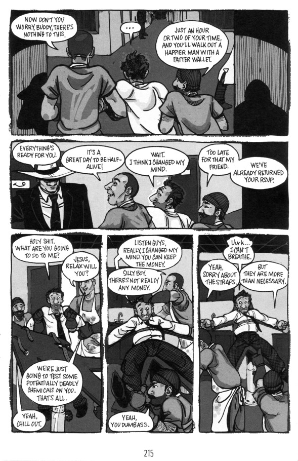 A message to the people out there who still miss Cerebus (like me, up until the last couple of years of its run where I stopped caring): maybe you should give Plastic Farm a shot. Granted, it’s not a monthly comic, which is where the loss of Cerebus is most acutely felt, but good luck finding another ongoing small press series that’s this compelling. I was all set to bitch about the fact that there’s no recap at the start of this one, but it turns out that this is the perfect volume for there to be no recap. A new reader who picked up the third volume (but for some reason skipped the first two, which is a little crazy) would have no trouble at all picking up the basics of the story, as a lot of this is one long, continuing origin story. For people who are just starting this now, go back and read some of my reviews for past issues, as I’m sure as hell not going to recap everything here. The short version of the early days of this series is that it was a number of stories involving a wide cast of characters, often not initially seeming to have anything to do with each other, and their connections were revealed gradually along the way. Oh, and Chester, as he’s the main character here, and either the savior of the universe or its destroyer. Or a crazy person, or something in between. Most of this volume takes place in an airport bar as people wait until the bad weather clears up and the flights start up again. Chester takes this time to tell his story to this room full of people, with each of them chiming in at different moments to tell their own stories (most of them engrossing, a few not so much, but the other characters are also aware of that fact). This volume starts off with both of his origin stories: being baptized by a mysterious group and then starting college. We see his introduction to alcohol and drugs (and ladies, really), with little hints along the way of the underlying insanity of his life. Rafer seems to have come to terms with the fact that his story is going to be much longer than he initially planned and he’s really enjoying the freedom that comes with having all kinds of space. Chester’s race to get to his first day of class, for example, would have been a panel or two if Rafer was still trying to cram all of this into a dozen or so issues, but he was able to take 25 pages to really show every aspect of it. I was also impressed with how seamlessly this graphic novel came together, as I know it came from single issues but it was really hard to tell where one issue stopped and another started (that’s the highest compliment I can give, in case that wasn’t clear). We also get our first clear glimpses of what exactly that mouse-like creature is all about as well as a holding room of sorts for some of the more imaginative creatures I’ve seen outside of an issue of Idiotland (and those creatures were almost universally gross, while these are mostly just… odd). I’m hoping, unrealistically probably, that Rafer already has the fourth volume ready for SPACE in a couple of weeks, as I’ve gone from cautiously optimistic that he’d be able to pull all these disparate threads together to having full confidence in his ability to do so after reading this one. Provided that there’s still a Kickstarter around or something that he can use to finance them, that is. Of course, that would probably also be less of an issue if all kinds of people started buying his books. Try that out, see what happens! $16.99