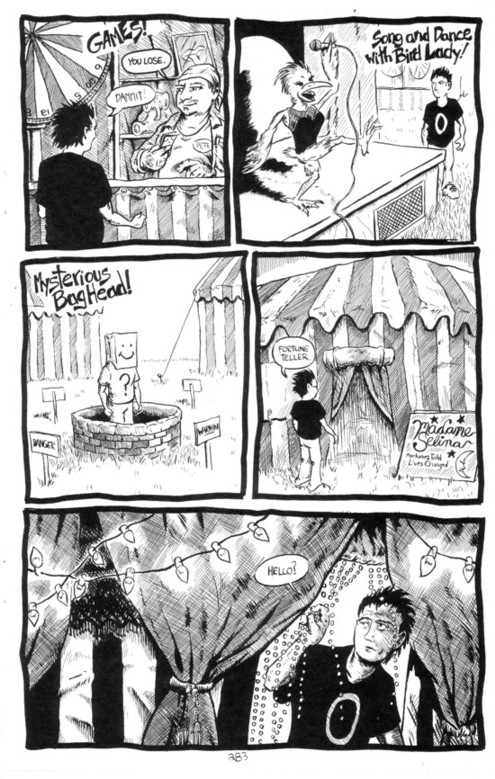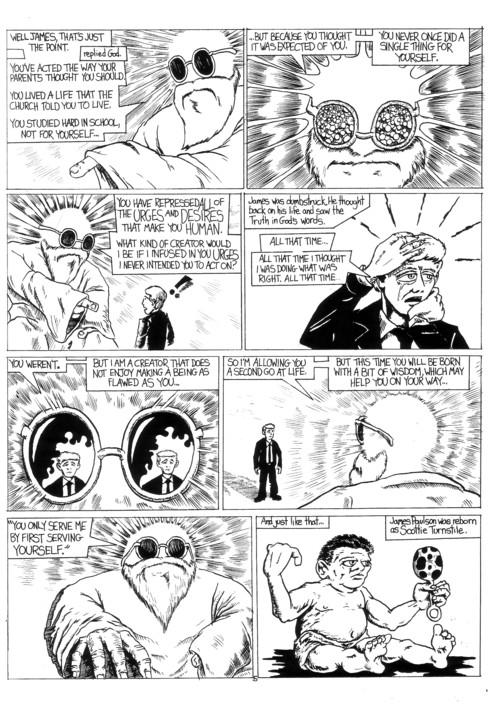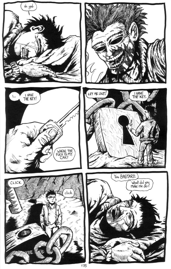 Hey, wait a minute, Rafer threw an obscenity in his title! I saw it as “mis-hit” before typing it out, now it’s clear what he’s doing with that title. Kids, ask your parents about it. This is, as the title suggests a collection of Rafer’s non-Plastic Farm comics for 11 years and, as such, is a bit spotty in the quality department. He starts with a series of his weekly strips for a college newspaper, not the best of the bunch (as he freely points out) but rather the ones that have survived over the years. Mostly forgettable stuff, but you can see the germs for bits of Plastic Farm here. Next up is a short piece about his grandfather and his time in WWII, or at least the bits that he as willing to tell his grandkids. Following this is a piece about the father of Behaviorism and his torture (basically) of a young kid while trying to prove his theories. The heart of the book comes next, and my favorite story, about a young man and his life of absolute piety. The trouble comes when he meets God after death and is told in no uncertain terms that he’s wasted his life… but gets a chance to get things right. A few more shorties round out the book, dealing with a world traveler finally settling down (after finding a successor), a melting dog, and a redrawing of a comic Rafer did when he was 9. I love the fact that he kept the dialogue exactly the same as written when he was a little kid, and the addition of some pages of original art from the story was a nice touch. It also helped show why he bothered to redraw it now, frankly, but modern day Rafer playing around with a variety of monsters is much more interesting than 9 year old Rafer doing the same thing. In the end, this is a collection that you’re going to be a lot more interested in if you’ve already read the bulk of Plastic Farm and just want to see more of his stuff. Don’t get me wrong, there’s enough in here to keep the casual comics fan entertained, but this is mostly aimed at people who are already fans of his work. Not sure about the price, and I don’t see it on his woefully unupdated website, but it looks like it would be about $10.