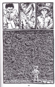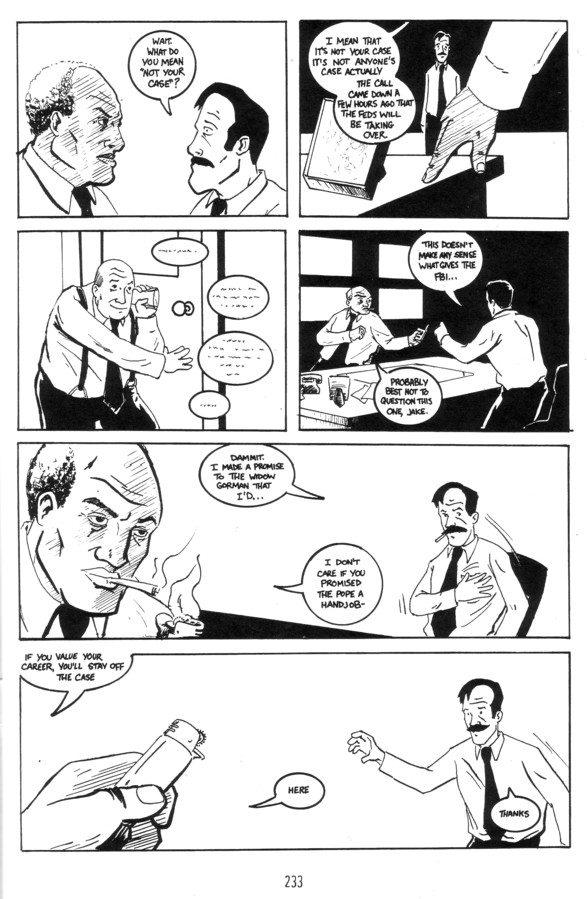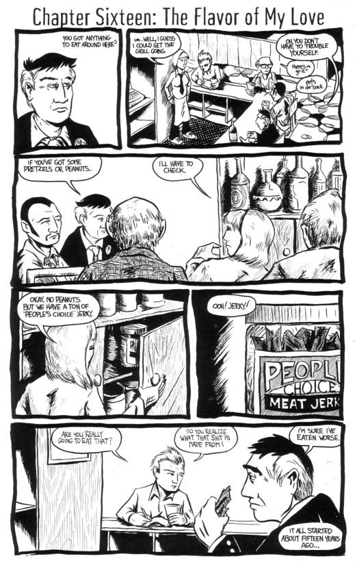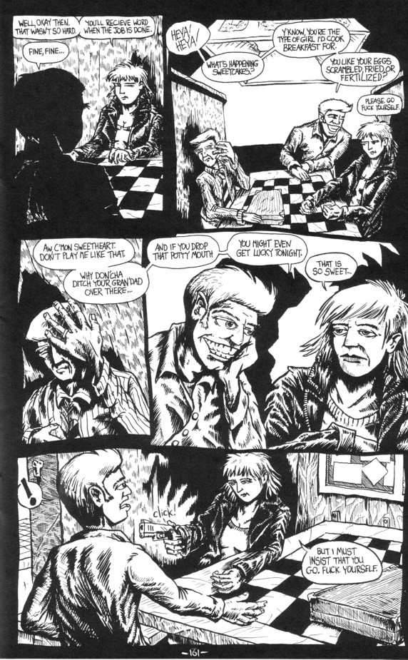 OK, at this point I’m just holding out to read them all together. That timeline in the front does wonders, don’t get me wrong, but I want to go back past the bullet points of who these people are and what’s going on. Many chapters in this, as promised, including that one diner everybody’s at, those cannibals, more clean-up from the trail leading to Chester Carter, that one guy who was waiting for his wife, a rich man who has to do some nasty stuff to get an inheritance, and then back to the diner. If that sentence doesn’t make any sense to you, it’s because you haven’t been reading this series, which must be because you hate comics, because this is everything an episodic comic series should be. Big old review for the next issue, as it’s the end of this storyline so I’ll be giving my opinion of the whole damned thing. I know, you can hardly wait, but I figure a good ramble will be in order after re-reading the first 300 pages or so of this saga. Oh, and Dave Sim sends a letter of advice in too, for those of you who were wondering if Dave was going to stick around in the comics field at least. $2.95