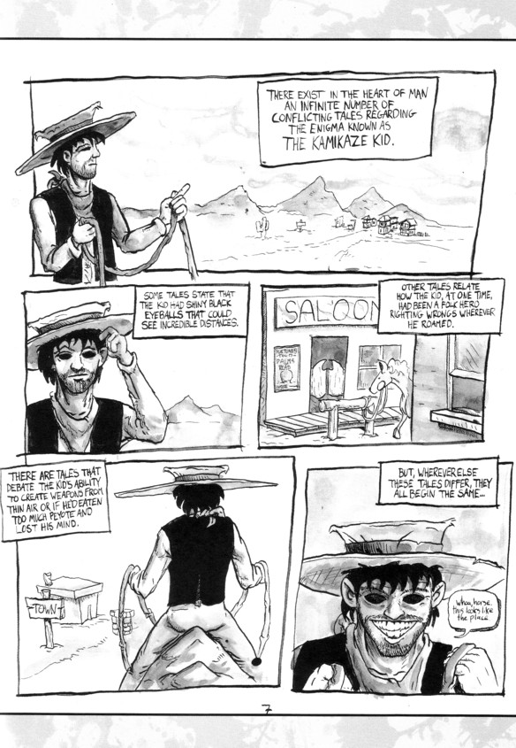 What the hell? Sorry, I know that these are only connected in the loosest of terms at this point, and obviously it’s all going to make sense when it’s done, but what the hell does this issue have to do with anything else? I know, I know, it’s probably just setting up characters who’ll play a major (or minor) role later on and it’s best to have patience. That’s not much of a problem because the next issue has one of the more interesting characters, The Kamikaze Kid, featured pretty heavily. Still, one of these days Rafer is going to have to start tying some of these threads together, at least loosely, or I’m afraid he’s going to start losing people. It’s an admirable thing he’s doing here, setting everything up deliberately and carefully, I just hope he’s not overestimating the patience of his audience. Not me, though, I’m pretty well hooked, barring some serious drop in quality. Oh yeah, the actual comic. I’m supposed to be talkig about that. Well, there are two stories in here. The first one is about a man who can turn his belly button from an innie to an outie at will and his subsequent rise to fame and the inevitable crash. The second story is about a paid assassin who gets a little too close to her target and her problems with the whole thing. I’d tell you more about how they relate to the rest of the larger story, but I honestly have no idea. Both entertaining stories in their own right though, with Jake Warrenfeltz pitching in on the first story and Rafer writing and drawing the second. This issue will probably make sense later, but it’s tough to recommend this story on an issue by issue basis. If you want to dig in (and you should, it’s a fascinating story in a lot of ways so far) you’re better off buying issues in chunks than one at a time. OK, contact info is up there, i can’t wait to get to #8!