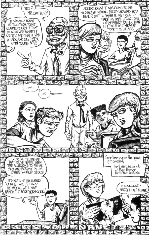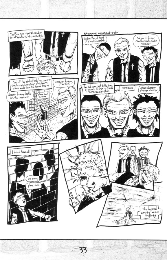 This issue is a lot more focused than the last one, as it’s all about Chester sitting in a bar and telling his life story to the bartender. Well, part of his life story, anyway. It goes from his being left on a church doorstep as a baby to life in a home for disturbed boys right up to the point that he gets some advice about attempting an escape. In other words, great stuff for a second issue, because now I can’t wait to see what happens next. Rafer also mentioned something at the start of this of only having 48 issues left to go, so here’s hoping that he has a plan, and the ability to finish, a 50 issue run. The back-up story, called Progressions (by Jeff Coleman & Stephen Greenwood-Hyde), is a rollicking kung-fu romp involving cheesy dialogue, many killings and close-ups of feet. If you think that’s a terrible idea, shame on you. Maybe for a huge series or something, but for 8 pages it’s wonderful. Anyway, as I may have mentioned, I have no idea where the main story is going here… and I couldn’t care less. As long as it’s good to read issue by issue I’m willing to wait for some serious cohesion. Contact info up there, it’s $2.95 and, as there are already at least 6 issues out, it might not be a bad idea to check a few of them out and see what you think…