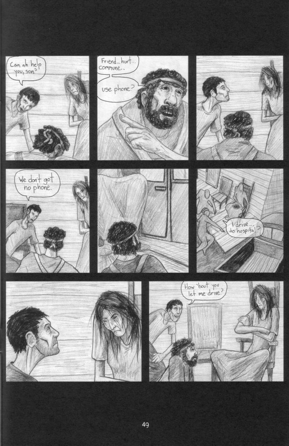 Well, this series has offically stopped making sense. Rafer mentions in his intro that this issue has little to do with the previous issues, at least right now, but for us to trust him because he knows what he’s doing. OK, I’ll trust him. After all, I still have three issues sitting here, so I can verify that he knows what he’s doing by what happens next. If it’s still a mess by the end of #6, watch out! Because, um, consequences will be dire! Anyway, this one has two unrelated chapters to keep us busy. In the first one we have two skinny people who are reluctantly eating their dog. They seem to have a working truck, so why they’re eating their dog is a complete mystery. They’re called on by a local commune to help with an injured member, and that’s the chapter. Then you have a drug deal of some kind going down involving a couple of detectives and a big crime figure. That’s it for the main story. I have no idea at all where he’s going with this, but he showed me with the first two issues that he can spin a compelling (and confusing) yarn, so I’ll stick around for a bit. The back-up story is by Sean Frost and Wendi Strang-Frost, and it might make even less sense than the rest of the book. All in all, easily the most confusing book of the series yet. Buy it today! $2.95, contact info is up there…