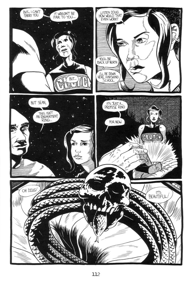 For some reason I haven’t been keeping track of the artist for these issues, as Rafer only drew #1 and 2 (according to his website). Oops. I’ll dig up the rest of them soon. I mention this because, really for the first time in the series, some of the art was noticably bad. I don’t know if it was rushed or if it’s just really tough to draw a rapidly changing party scene with people dancing and causing a ruckus, but those first 6 pages or so were tough to look at. After that it was fine, but that party scene was something else. Anyway, this issue still has nothing to do with anything else, at least not yet. It was titled “Sean”, so I’m guessing she’s the character to keep an eye on. Sean and a couple of friends crash a party, literally, and cause some havoc. The rest of the issue is calmer, dealing with Sean and her boyfriend, who is leaving as Sean sticks around for a year or so to get her degree. The backup story was an illustrated poem by Matt Dembicki called Witch’s Tongue, which had the benefits of looking great and being more than a little bit creepy. All in all this was the weakest issue of the bunch, mostly due to that crappy stretch of art and a disjointed story, but the disjointed story is one of the good things about this comic. What can I say, I’m taking them as they come. Maybe this’ll turn out to be a crucial issue later, but I’d say pick up pretty much any one of the other issues for a better example of what this series is capable of. $2.95