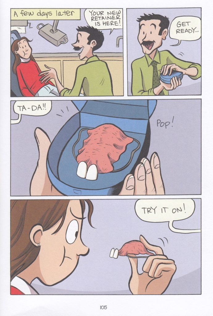 It’s been at least a decade since I reviewed one of Raina’s comics. That’s been one of the weirdest parts of running a comics review website for so long: I tend to lose track of artists, even the ones I really like, because I get buried in review comics and/or don’t have the resources to buy all the graphic novels in the world. It’s true, this isn’t a lucrative gig! Still, I reviewed the first Smile mini comic in 2008 (ish? The actual date is lost to time; too many site rebuilds), thought it showed a lot of promise and that it might end up being her best work yet, and then… nothing. As I don’t have kids, I had no idea for years that Raina became a rock star in the young adult book world, with several different graphic novels and a devoted fan base. And she’s a legit #1 New York Times best seller! Don’t mind me, I’m just always happy to see ridiculously talented artists make a living off their work, let alone become famous with it. Anyway, I’ve always wondered what the finished Smile would look like, and since I now live a block away from a library (in one of the best library systems in the country), I can find out. No big surprises here, but it’s pretty great. The mini comic I reviewed ages ago basically just covered her injury and initial reaction; obviously this is able to get into much more detail. The basic story is that Raina knocked out her two front teeth when she was in 6th grade. Well, she knocked out one tooth and knocked the other one up into her gums. Yeah, take a minute with that one if you need to. Anyway, this is the story of the next four and a half years of her life, of all the various procedures, operations and headgear she’d have to deal with to fix her teeth. Obviously this would all be rough enough at any time, but she made the transition from middle school to high school while all this was happening, and all the gory details are included. I can also see why she’s become such a star with the kids, as this book dragged me right back into my own middle school experience. She has to deal with crushes on boys, boys having crushes on her, her friends both having her back and not having her back, and an occasionally obnoxious little sister. This is one of those times when you REALLY don’t need me to tell you to check an artist out, as most people reading this have undoubtedly already read her work. But just in case you’re one of the few people who haven’t, maybe start here? As for me, I’m going to go back and see what else I missed from her over the years. $24.99