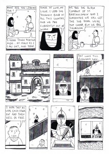 Who likes some good old fashioned mayhem involving knights, mercenaries and castles? Everybody? Excellent. This is the tale of a knight with ambiguous motives who wanders into a small town. This knight goes to the local inn and hears all about the place: it’s being fought over by three people, and their fight is breaking the townsfolk, both financially and physically. So this knight decides that the best way to make a few bucks is by turning these three people even further against each other by killing/kidnapping various members of each group. This is another case where it’s difficult to dig much into anything without giving way too much away, but whether you like your adventure tales grand or maybe not so grand you’ll find plenty to like here. Rob does a great job of plotting everything out intricately while still keeping the allegiances easy for the reader to follow. He’s also come a long way in his depictions of fight scenes, as everything flowed together smoothly from panel to panel. That may sound like faint praise, but it’s really not easy to depict fluid action in a static panel format, and he nailed it. He’s still building an impressive comics library (and he sent along two more books with this, so he’s adding to that library at an impressive pace), and there’s still plenty of stuff in here that just about anybody should at least try out. So hey, if you’re a Game of Thrones fan, but maybe think that that show is somehow not quite cynical enough, you’re in luck!