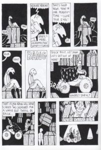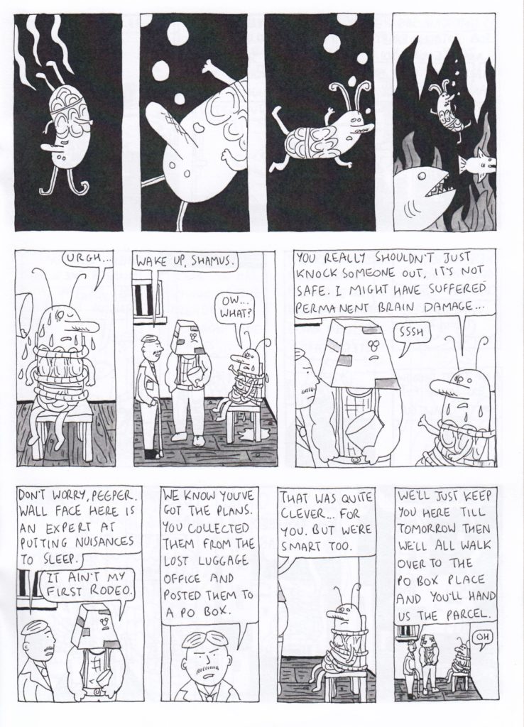 I won’t tell you why, but I will tell you that this comic ends with a song. And still I somehow resisted the temptation to not use that final page as the sample image! Sometimes this reviewing thing is a sheer test of willpower. So what’s up with this one? It’s a sprawling conspiracy, all with our hero Trashcan P.I. at the center of everything. Things start off with our hero creepily sizing up a young lady who’s come by his office… er, trash can, trying to get help in locating her missing brother. This is where a traditional noir story would begin their romance, but this comic doesn’t go anywhere near that. Possibly because the dude lives in and conducts business out of a bin, which traditionally has been a bit of an impediment in the romance department. So our hero tracks down leads, gets knocked out (which I’m using as a sample image purely because I’ve also often wondered why it’s so accepted in movies to bludgeon people into unconsciousness), and generally spends the bulk of the comic trying to get to the bottom of things. It all spirals into a vast connected gaggle of characters, and you’d better believe that things end in mayhem. I recently watched The Maltese Falcon and was a bit surprised how many of those tropes made it into this issue. Of course, noirs all have at least similar events happening (femme fatale, double crosses, bad guys accidentally telling the detective too much, etc.), so it’s not like I’m assigning any nefarious intent. Besides, all of the ladies loved Sam Spade, so that’s a pretty substantial difference right off the bat. And since I’m not going to tell you all the bits leading up to the dramatic conclusion, I’ll have to content myself and you by revealing a few of the (fantastic) names that Rob has come up with. Wall Face! Big Orange! Smart Guy Eddie! Big Jim Tuckshop! OK, that last one doesn’t even have a cameo, but what a name to put on a mailbox. If you’re already a fan of Rob’s, of course you should give this one a shot. You probably knew that already, as it’s not like the guy makes a lot of stinkers. If you’re new to his work, I’d recommend one of the heftier titles, but if you’re also on a budget and love noirs, you could do a lot worse than this one. If my internal currency converter is even close to correct (it almost certainly is not), then this is roughly $6.