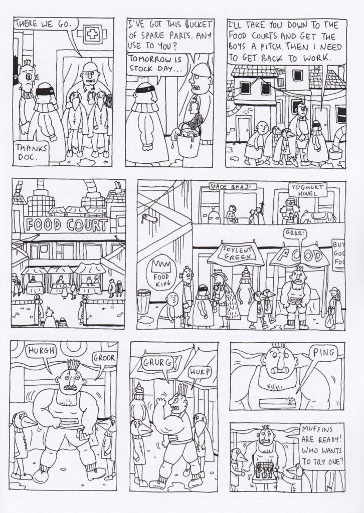 It never ceases to amaze me how far Rob can get from the humble beginnings of a story. This one, for example, starts off simply enough, with a gang of guys waiting for the right moment to strip a car of its tires. Right away the title doesn’t make a whole lot of sense, right? Yeah, you have to wait for the payoff on that one. Anyway, we learn that these guys had been saving money, and they finally have enough to go to “Big Town.” From here we learn that this gang is actually made up of tiny people, and there’s some serious friction with the larger folk. But we also soon learn that there are even larger people involved, and eventually we start to piece together exactly what kind of a society we’re dealing with. They’re forced to retreat to yet another society, which is where we learn exactly how people ended up as different sizes, with different expectations as to what roles they’re meant to fill in society. Oh, and at this point the comic isn’t even halfway done yet. Rob has always excelled at filling his comics with imaginative details, which is even more impressive when you consider that (outside of a few exceptions) he works in single issues, meaning he’s starting over from scratch every time. Anybody who’s looking to excel in comics should take a look at his workload and history, there’s a lot here that should be emulated. About the only negative thing I have to say is the same thing I’ve said a bunch of times probably by now: I wish he had a better command of the your/you’re differences. Oddly, I enjoy his comics so much that I’ve made peace with it. And if you knew how much I enjoyed being a pedant about that sort of thing, you’d understand why that’s such a big deal. Prices are listed in Euros, so in American dollars for this 52 page book I’m guessing… maybe $10? Somewhere around there, anyway. It’s worth a look, so go look at conversion rates. If you give him too much money, just ask him to send along some of his other books to make up the difference…
