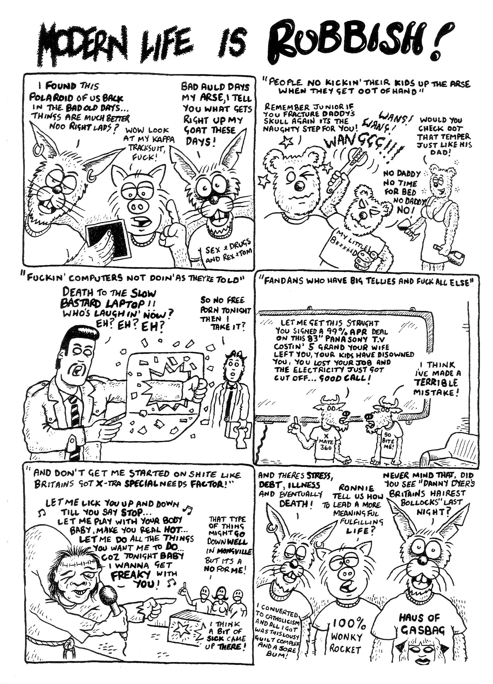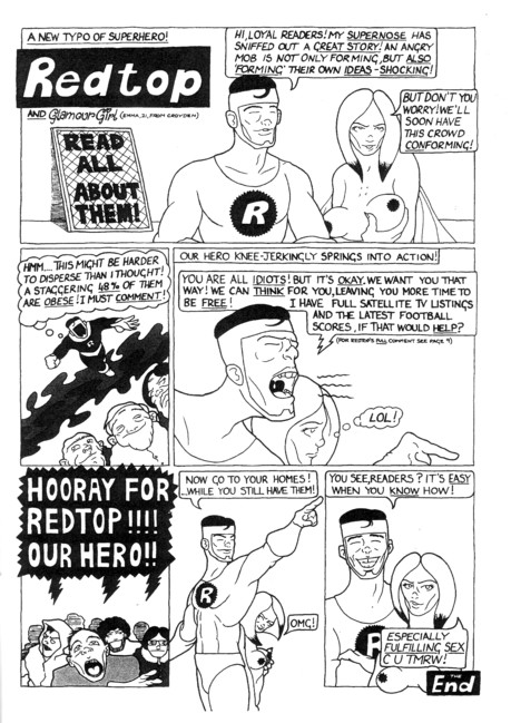 First thing first: I have no idea if Mark Sampson is really the editor of this comic. He wrote the intro for the book and introduced everyone, so I’m just assuming here, and am hoping that the fine folks who sent me this comic will be nice enough to correct me if I’m wrong. This is an anthology out of Glasgow, and the fact that it’s up to #26 (I checked the website) is pretty damned impressive. And, apart from the strange obsession with “arse” and “bum” being the apparent pinnacle of humor, there was a pretty funny pile of stories included. Stories in here include a superhero that patrols the red carpet by Rob Miller, Martin and Adam Smith’s piece about two guys stuck out of time that seems to think a giant fart is the funniest thing in the world, Rob Miller with a mostly incomprehensible piece, Rob again sticking it to the man, a story by some guy (this is what happens when you don’t put a table of contents in your book or at least clearly label the creators) about nostalgia and shallowness, another piece by Rob that insists on making the reader wallow in shit, Larned Justin on traveling to Glasgow after being accepted to do a strip for the book, some other guy with a piece on the lion and the crocodile, Rob (who is, at the very least, nice enough to sign his pieces) with a longer story that’s a bit on the incomprehensible side, A.J. Smith with a sad drunken guy (and at least they made note of the fact that this particular strip used up their allotted scatological humor for the year), some other guy with time traveling priests, and Rob again with a brief Star Trek parody. See how much better this might be with a table of contents? I could look up each individual artist, compare styles and try to figure it all out, but it’s not like I’m getting paid for this gig. It still ends up, on balance, being a pile of funny, and I realize that dry descriptions are not the best way to explain comedic tales. The poop humor gets a little old, then tiresome, then annoying, but if you can get past that (or if it’s your thing) then there’s plenty to like about this comic. That price is, I believe, right around $2 in Americaland, which is a steal for this much content.