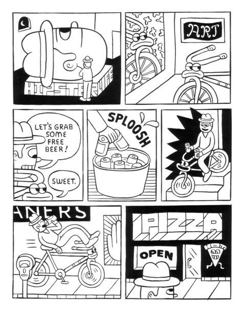 Hey look, an anthology! I’ve never understood why so few of these clearly label who did which pages (some even have page listings for the artist without having the actual pages numbered). This one at least has a chronological listing of the artists, but the nature of this book makes it difficult to tell where one story ends and another begins. Why? They’re mostly highly interpretive blasts of art, that’s why. Still, I’ll give you a list of who’s in this and you’ll most likely be properly amazed and impressed. There’s Ron Rege Jr.(looking less deliberative than I’ve seen him, and I’m a bigger fan of that than I of the mildly sloppy story in this issue (said mostly because the bits of text are hard to follow)), Jason Overby (brilliantly smacking the preconceived notion of what makes a comic strip around), Dave Nuss (with a welcome quiet moment of the Roman soldier who theoretically jabbed Jesus in the ribs), Andrew Smith (puking a tuna melt is the worst), Hector Serna Jr. (I could spend the whole review trying to unpack those images), Brent Harada (with a mildly out of place regular old story about searching for boots in thrift stores), Robyn Jordan (a quiet piece about camping), John Hankiewicz (a breath of fresh, distinctive air in a sea of chaos), Grant Reynolds (with one of his more disturbing pieces, and that’s saying something), Ayo Kuramoto & Amane Yamamoto (please place your review here, this went right over my head), Rusty Jordan (this is where it starts getting really difficult to tell where one artist ends and another begins, I believe his piece is the one with the escaping brain), Luke Ramsey (ditto, I believe his stuff is the series of full page heads), and Andy Rementer (an oddly adorable piece after all this about a man, his bike and their mutual love). Or maybe Andy Rementer is the one who did that utterly horrific back cover? Hard to tell, and that website doesn’t clear it up a bit. Oh well, with that list of stars it’s a hard thing to pass up, and the quality of most of the stories makes it even more difficult. And if you don’t love that cover, well, I’m afraid there’s no hope for you. It is a fairly hefty $9, but it’s put together nicely. You decide!