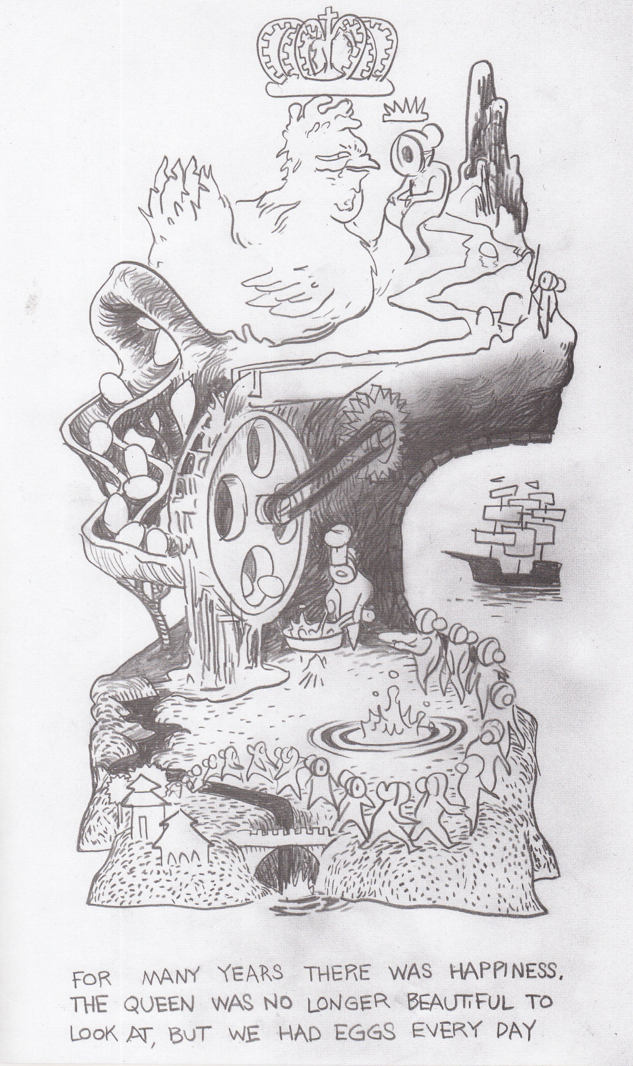 You know that part of the comic where things need to get wrapped up in some fashion, and you’re left wondering what exactly the creator was going for with that ending? Well, without giving anything away here, that’s where I am with the end of this comic. It seemed like the events of the end of this were going to get a bit of an explanation, then the comic literally just faded away. Boy howdy am I ever getting ahead of myself with this review, but that’s the last part that I read, so it’s the first part on my mind. This one starts off with a race of people relocating to a new island. They find a giant egg pretty early on, and it becomes a crucial event in the development of their society. The egg eventually hatches and the giant chicken is adopted by the king, eventually taking over as ruler of this land (as you may have guessed from that title). The chicken queen marries her best friend, they reign happily for many years, and her friend eventually dies of natural causes. From there the queen becomes different, mostly showing this by being more distant, but the violence does come eventually. While I may not have been totally happy about the ending, the individual pages were fantastic, as there’s plenty happening on every page. Each page is one panel, and they each show basically the entirety of the island and many things that are happening on it. I did like the bit towards the end describing the inability of the townspeople to communicate with the chicken and why that was the case, I was just a little underwhelmed with the ending. To me that still makes this a comic well worth reading, as I thoroughly enjoyed the ride and several little touches along the way. If you’re the type who has to have a completely satisfying ending to make it all worthwhile, maybe you should move along. Of course, there’s always the chance that other people will have a different opinion of the ending than I do. Shocking, I know! $5