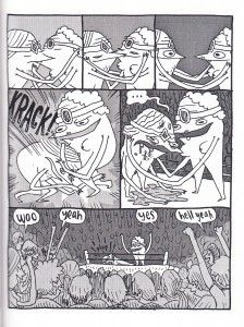 Sometimes my rule about never listing any spoilers really hinders some of the points I should be making. This comic was damned near a masterpiece before it reached that ending, which kicked it up a few notches. Mega-masterpiece? Masterpieceapocalypse? Make up your own awesome word, it won’t be as great as this ending. Still, I’m getting ahead of myself. Fight is the story of a professional wrestler/monster named Fight. He’s having a good run as champion until a female version of himself called Super Fight comes onto the scene. He falls instantly in love and she takes advantage of his distraction to beat him and win his title. It turns out that Fight managed to get Super Fight pregnant during their kiss (hey, they’re monsters, who’s to say how they reproduce?) and she has a baby called Fight 64. This thing seems to exist purely to cause mayhem in various situations (I would direct your attention in particular to the chapter dealing with the pathetic creature known as the Boobstadon). Meanwhile Fight is down on his luck after losing his title, attempting to get a series of humiliating jobs, and Super Fight seems to be trying to drink herself to death. All three of these characters stay away from each other until right near the end and, as I’ve mentioned, what an ending it is. The book is a damned epic, and this in a book that I assumed would be merely funny with a bit of a punch-’em-up thrown in, which is what I get for assuming. This book won a Xeric award, and this world would be a poorer place if the money didn’t exist to put this book out, which maintains their damned near perfect grant record. I guess you might hate this if you’re looking for a heartfelt tale of introspection and loss, but if that was the case you probably wouldn’t be picking up a book called “Fight” anyway. Read it, love it, and recommend it to your friends. Yes, even the ones who don’t like comics. If they like funny things done well then you just might manage to convert them to comics. $5