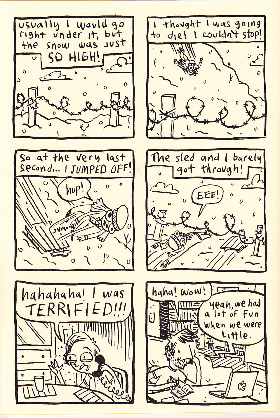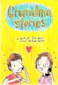 It’s always a good sign when I go to a creator’s website to check on the price of the comic I’m going to review and end up spending a good 10 minutes thoroughly enjoying the strips. Sam also does a (mostly, it seems) daily four panel strip about his life and, from what I can tell from 10 minutes of reading, it’s fantastic. But we’re here to talk about this comic, not his apparent awesomeness in general. This comic is exactly what the title implies: it’s Sam having conversations on the phone with his grandma (with a short phone conversation with his mom thrown in for some history on his grandma) as she tells him stories of her life for his 24 hour comic. It didn’t technically end up being a 24 hour comic, as he apparently didn’t finish inking 9 pages out of the 24 during the time period, but this comic has an amazing level of detail for a 24 hour book. Backgrounds a’plenty, and it only looked a little rushed in a few isolated spots. Anybody who has read a few of these timed books knows that it can get ugly, and this book had none of those problems. Anyway, stories from his grandma include her collecting supplies for the WWII war effort (when she was a kid), trying to convince her young brother to like his school, an incident with a sled and some barbed wire at the bottom of a hill, and collecting smooth stones to use as toys. There are also a few bits thrown in about life as it’s happening to her now (these are phone conversations, after all) and Sam eventually concedes that she’s told him way too many stories to put into this book. That sounds like a graphic novel to me, as everything they talked about was thoroughly entertaining, but what do I know? There’s also a nice color epilogue on the back page where Sam talks about spending time with his grandparents when he was a kid. It’s a thoroughly engaging little book, and don’t get scared off because you think this one might be too sweet for you. It’s touching, sure, but also funny as hell, and that one always wins out for me. $3