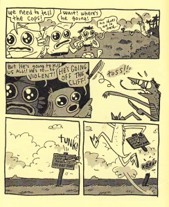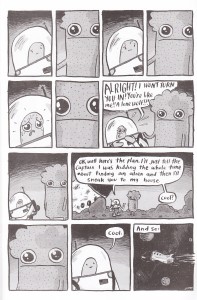 It always makes my job so easy when I can use basically any page of a comic for a sample and still have it be hilarious. That’ll probably give away my opinion of the book right there, but how much suspense were you expecting in a review? Get a grip on yourself. Anyway, this is mostly a 24 hour comic (“mostly” meaning that Sam drew the whole thing in 24 hours, then went back in after the time limit to add some greys, which still counts in my book) about the life of a man/creature named Daggur. He is absolutely awesome and the idol of the children of his area, but he has a crisis of conscience when it dawns on him just what he’s done after the children praise his killing of a sea creature. So he goes back and examines why he is what he is, which leads to an eventual confrontation with said cause, and the introduction int my life of the word “whangel.” Sorry, you’re going to have to read the comic to find out what that means, although I guess it’s possible if you just break the word down a bit. Oh, and the last page of this book is something that should be put in a time capsule to show to future generations/our eventual alien conquerors, as it sums this whole “life” thing up pretty well. Buy it, read it, laugh. $2