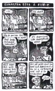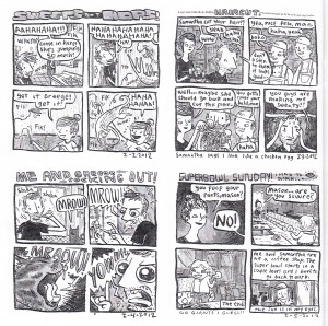 Oh hi diary comics! As always, if you have some kind of personal vendetta against diary comics you should probably get a better class of enemy, but you also already know that this collection isn’t for you. But I loved this pile of strips, and you’re bound to too if you like Sam’s other work or just think it’s worth your while to laugh a few dozen times (at least) while reading comics. One thing I should get out of the way early on: Sam mentions in one of his strips that he got a bad review from The Comics Journal (and I naturally can’t find it now, which should tell you again how hefty this collection is) where they call it repetitive and something else that I didn’t agree with. I don’t understand how that’s a legitimate line of complaint, as ALL diary strips are repetitive. It’s not like any of the cartoonists doing these are documenting their time in chemo after getting cancer. These are mostly guys or ladies (actually mostly guys from what I’ve seen, but I’d be happy to be proven wrong) in their 20’s or early 30’s, usually not satisfied with their job and/or their place in life, and that situation can get either better or worse as the year goes along. There’s bound to be some repetition in that. At least Sam takes a few strips in this one to openly question the motivation for what he’s doing and if he can get anything out of it. He stopped doing the diary strip after this one, and there’s a thorough explanation as to why that happened in the end. Anyway, how about the actual strips? Right away I love the fact that he puts tiny strips about the life of a fly on the inside flaps of this book. Hey, why waste empty space? Subjects in these strips include hanging out with friends, puking and/or trying not to puke, adventures with his cat, conversations with his girlfriend, going out to see shows, getting to meet his comics hero (James Kochalka), chatting with Siri, feeling morally guilty about playing a certain video game, not having time to finish Skyrim, and the big old cliffhanger at the end. Oh, they’re about significantly more things than that, as there are 365ish strips in here, but why would you want me to describe them all to you? Sam has a knack of being effortlessly funny, and that kind of thing really shines through on a daily basis like this. Sure, there are strips where he’s obviously a bit rushed (and he often comments on that fact), and a few that feel phoned in, but who cares? A good 4/5 of this is thoroughly entertaining, and I’m probably being conservative with that number. Check out his website and read a few for yourselves if you don’t believe me, and it also looks like he’s drifting back into the daily diary territory again, or at least drawing them a few times a week. $7