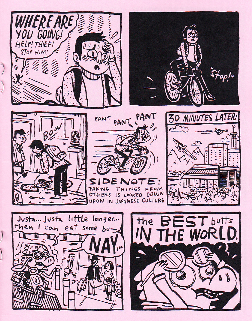 Well, we’re at the halfway point in the Tarn saga (I’m aware that it doesn’t make any sense to call five issues of a mini comic a saga, but I’m sticking with it anyway). And characters are starting to interact with each other a bit more, so it’s clearly all leading to a dramatic conclusion with them all pointing guns at each other. I haven’t read the last two issues yet, obviously, but I am so very hoping that that is true. Anyway, this time around we meet Sans San, and his thing is that he’s always late. And he speaks Japanese, or possibly gibberish (according to another character), but I’d need a translator to know for sure. He has a job interview, plenty of time to get there and he is determined not to be late for once. But! As he throws up his arms in celebration, his keys go flying off straight into the bag of the guy who eats butts from the first issue. Which might not have been that bad, but said guy was riding on a scooter at the time, so he’s out of earshot before Sans is even able to register what happened. The rest of the issue is a desperate chase involving a language barrier, the constraints of honor and an unexpected team-up. OK, maybe it’s expected because they’re both in this issue, but the way in which they teamed up was still unexpected. Another solid issue, one more reason for you to check out this series. $1