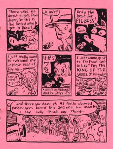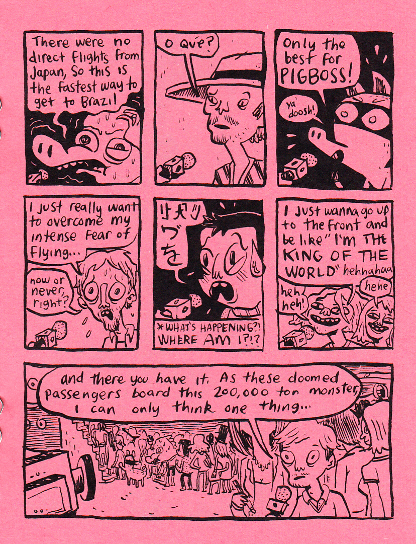 Oh, so that’s where all this was heading. Still no clue about the title, but there’s still one more issue to figure that out. This time around we meet Mr. Harland, the shirtless person (?) from the front cover. He has commissioned the Titanic 2, which is the largest airplane ever built. When asked about the negative connotations of that name, he merely points out the box office totals from the film with the name “Titanic” to prove his point that it’s a good idea. From there we learn that the entire cast of characters has ended up on this flight by one way or another, and we get the first hilarious interaction between the three characters from the earlier issues. The comic ends with the airplane very shakily taking off, and with a name like that I can’t imagine that the flight is going to end well. But that’s all to be discovered in the next issue and, once again, there’s no reason in the world for you not to be reading this. Find $5 in the couch cushions or something, send it to Sam, and enjoy. But maybe make it paper money first, as otherwise the postage would get ridiculous… $1