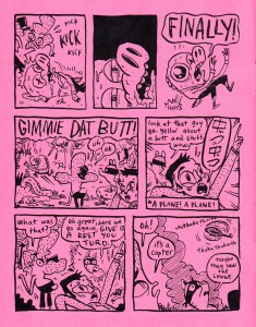 Warning! Don’t flip this comic over unless you want to have the ending spoiled for you. Such as it is, and it’s not like knowing this one detail would ruin your enjoyment of the rest of the series, but I thought I’d better throw that out there. Anyway, the secret of Tarn is revealed here, at least a little bit. Either that or it was never really a mystery, it was just a reading comprehension problem on my end. Things start off with the aftermath of the crash of Titanic 2, and all of our heroes have managed to survive the flight. Just barely in some cases, but they all made it. The Bich Bird comes down to make fun of the guy who planned Titanic 2, Sans finally gets somebody to understand him, Pigboss finds love, and Mr. Futts (after coming back from the dead) runs off in search of as many butts as he can find. Frankly, I see a spin-off comic for Mr. Futts, as we don’t see him again until the end of the comic, and his entire rampage is left to the imagination of the reader. Sam did a nice job of bringing this odd crew together and somehow managing to end all of their stories in a satisfying fashion. I’m still waiting for him to make a crappy comic, but so far the man has been a damned comics master, and you should be buying his new books as they come out to keep giving him reasons to make these funny books. Because sooner or later he’ll take his talents to a field where he is financially compensated in a manner appropriate to his talents, so let’s delay that day as long as possible! $1 (I think $5 for the set, that makes sense anyway)