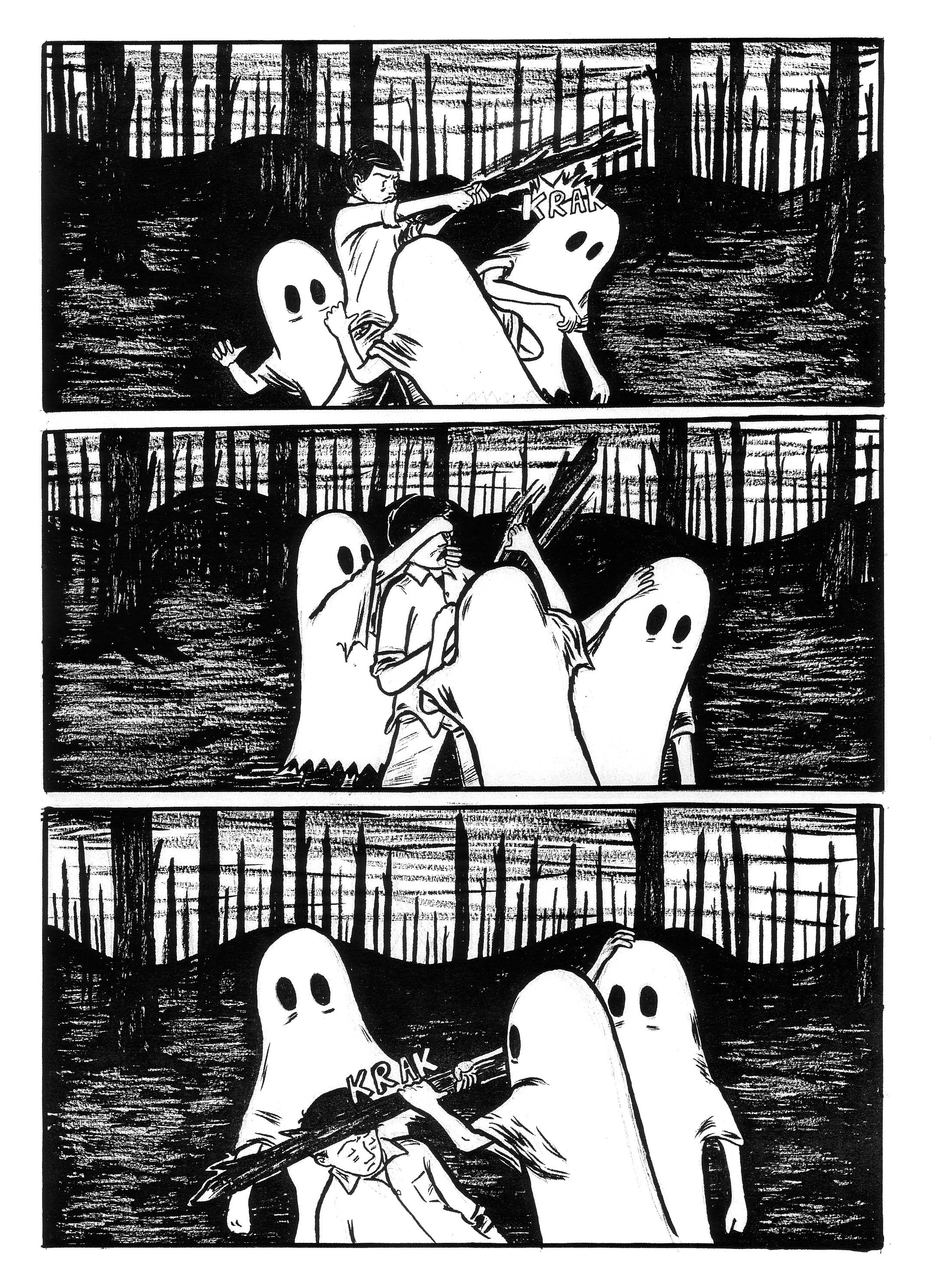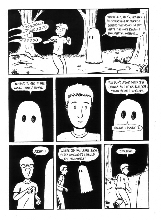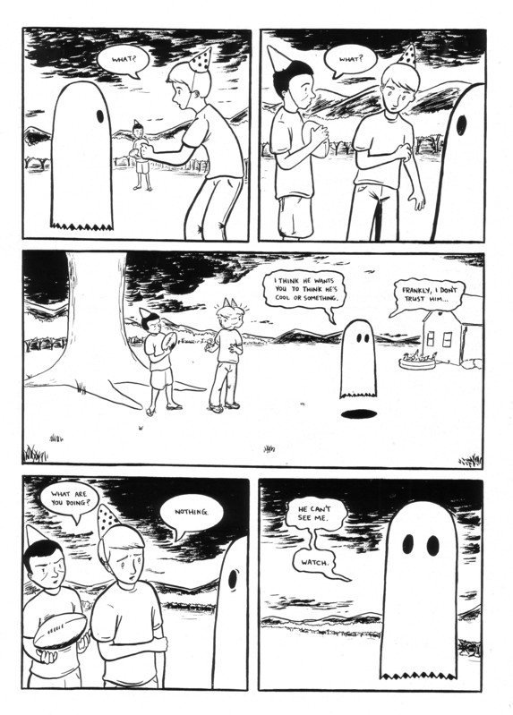 What’s that you say, Secret Acres? You have a sneak preview of a book coming out at SPX this year from the guy who made Only Skin, one of my favorite small press series of the last decade or so? Why yes, I am interested in reading it! Getting this book also made me realize that I probably never did read the ending for that series, since I got it issue by issue, but that’s a me problem. As for Shadow Hills, there’s a whole lot going on in this one, with a wide cast of characters. Things start off with a young boy walking through a wasteland, until finally passing out after he sees a nearby town. A young girl finds him and brings him home to help him, discovering that he can’t (or won’t) talk. We also learn her name, which is a clue I missed the first time around (even though it’s clearly meant to be obvious, making me a dummy), so keep an eye out. From there we jump to today (as “today” is usually defined in books), as a young woman named Anne goes through town and meets several of the residents. One other resident is missing, and towards the end of the first chapter we see her trying to make her way back to town as a mysterious black goo is enveloping her, seemingly from the inside out. From there the cops get involved, we meet several more townspeople, occasionally flash back again to Dana and the mysterious silent boy, and the menace of the goo steadily ramps up. That’s one thing that Sean has done spectacularly well here: the pacing. We get plenty of time with the town, seeing how it’s supposed to run in an average day, before things start spinning out of control. We learn about years old rivalries, best friends, what happens to Anne and her mother after her sister disappears as a child, along with the slow but steady drumbeat of a feeling that there’s just not going to be a way to solve this problem. Do they manage it? Well, the answer to that is a long time coming, and you’re not going to hear it from me. This book is a terrifying masterpiece, and yet another chance to wish that I had a pile of money that I could give to artists like Sean so they could spend as much time as they wanted making art like this. Or whatever they’d like, really, but you get my meaning. I don’t do ratings for my reviews, but this one gets my super duper fantabulous ranking, and you know what that means! …it means you should check it out when it comes out. Obviously! $23.95