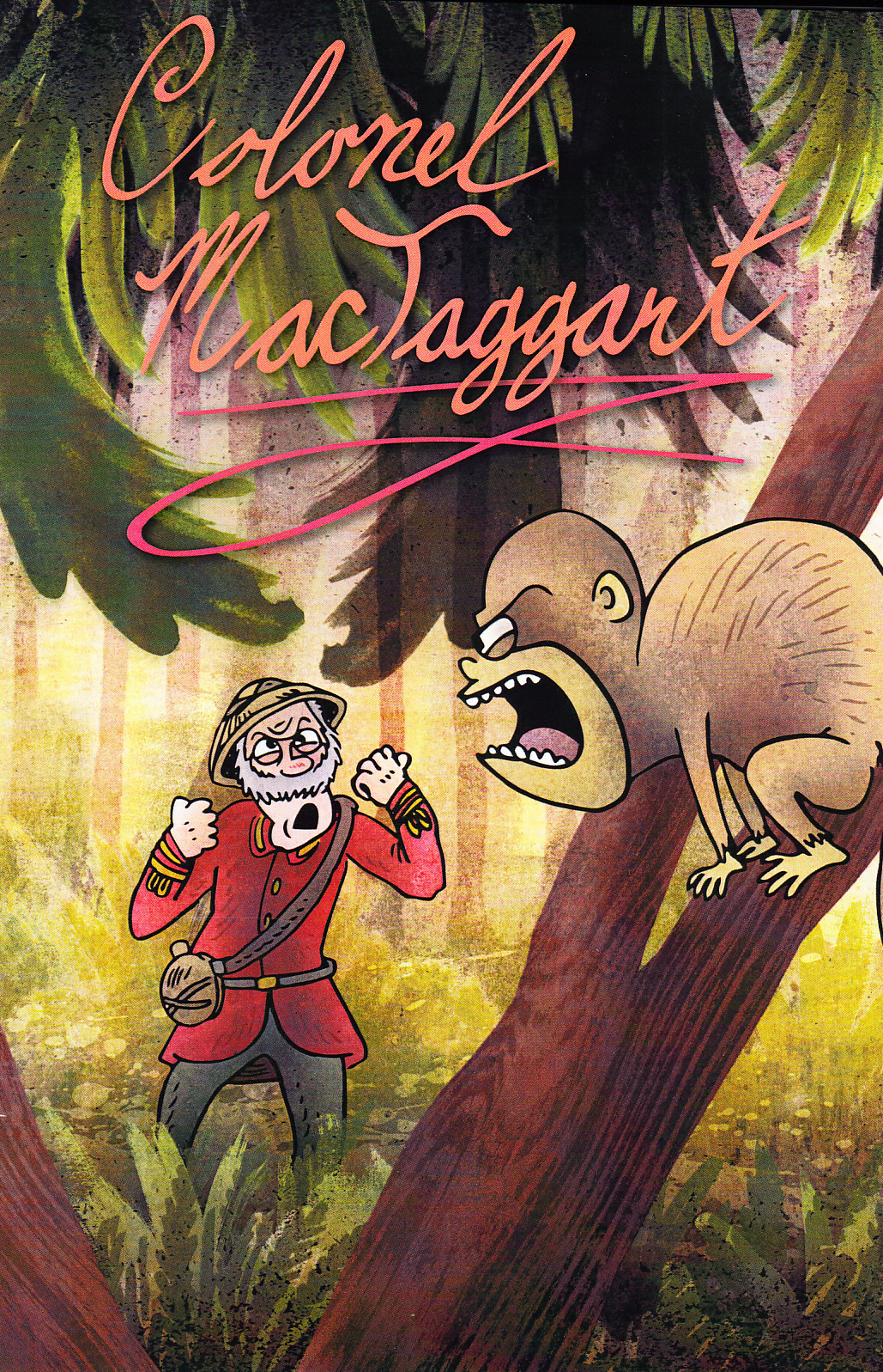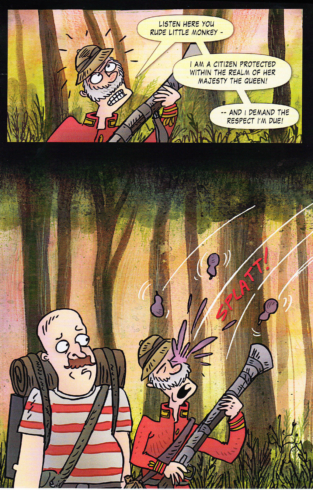 OK, granted, that cover image makes the lead character look an awful lot like another vaguely cubish character from a ridiculously popular cartoon. Assuming it’s still popular and, as I have no kids, I don’t know that for sure, so I’m talking about Spongebob Squarepants if it’s no longer popular or if you’re somehow reading this in the distant future. But what’s wrong with turning your lead character into a cube? It’s obvious even from the cover that this doesn’t really happen to him, that it’s just a dream, so where’s the harm? Who am I arguing with right now? Anyway, this is the story of a dream of the Colonel. We don’t see the reason for the odd dream until the end, but right away we see the Colonel coming to terms with his new form and learning that this form also allows him to transform other creatures (albeit with unpredictable effects). So our hero transforms a small lizard, turning it into a giant monster, and the monster is then killed by a tribe of “cone savages.” We get some solidly funny dialogue from the Colonel to this tribe, showing the delightful contempt that such explorers often showed for native people back in the day, which leads to their interaction taking a bit of a turn. I’m in danger of giving the whole thing away here, so I’ll just say that the eventual reason for his odd dream was brilliant. It’s a fun and funny book all around, and I’ll always agree with the idea that creatures who look like living candy corn should always be the villain. Oh, and it’s all in full and glorious color, assuming that such things matter to you, and why shouldn’t they?