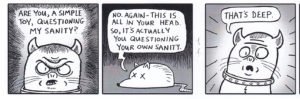 Cat people, gather round! Dog people and weirdos who don’t like any pets at all, this one probably isn’t for you. Or maybe it is, if you’re intrigued by the concept of a cat literally thinking that it’s Satan. But is it actually Satan, or is the cat crazy? That’s the premise of this unexpectedly complex issue. Don’t get me wrong, it’s all still easy enough to grasp, but the bulk of this comic is a conversation between the cat and a mouse toy, with the mouse toy playing the role of the sane one of the two. This toy also points out the absurdity of it being the rational one and that the cat should think about that, at which point the comic almost collapses in on itself. It’s another funny issue but, as is often the case with a mini this small, there’s not a whole lot for a reviewer to talk about outside of the basic “yea or nay” issue. So… yea! It’s always fun to watch one of the most smug creatures on the planet question its own sanity.