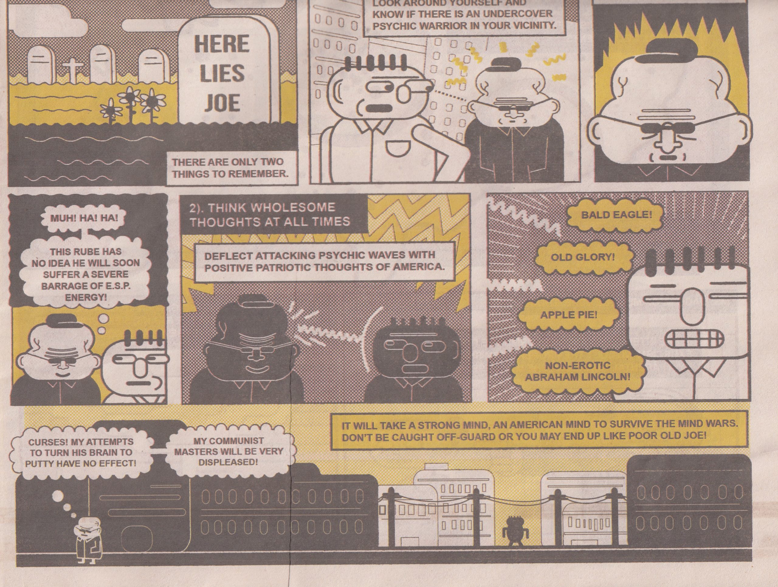 How can you not love that cover? I’m getting to like Steve’s art more and more, which is odd considering that he started sending me these zines when they were mostly text. This is the issue where Crocodile Man began his career as a recurring character, with a piece at the beginning and end of the comic: fantasizing about killing a coworker and engaging in some bathroom humor. Sandwiched between those are all kinds of goodies including a pretentious artist sitting in on a grade school art class, warning signs that your cat is possessed by Satan, an attention deficit monkey, how a tiny umbrella saves the day, how to deal with dangers at the park, a terrible football coach, and some genuinely awful (but hilarious) advice on how to get out of trouble with your girlfriend. There’s also a text piece about Oprah becoming president and another one of those pieces involving the explorers from #30, which I’m just going to ignore as it once again didn’t do a good thing for me, but why let that bring down an otherwise solid issue? I think Steve would be perfectly suited to a Mad magazine type of venue, if there was a funny Mad magazine type of thing currently being published. In the meantime he’s doing just fine here. $3