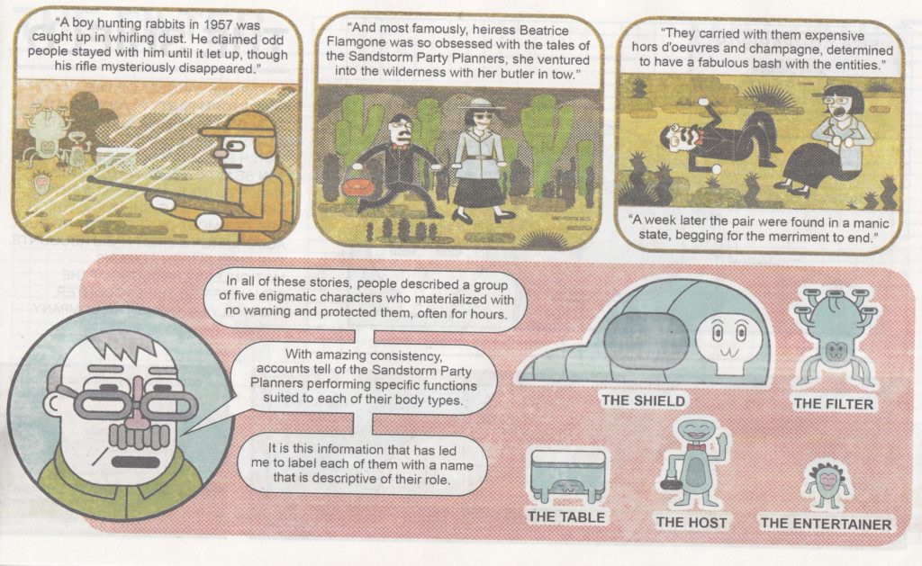 It’s another one of Steve’s newspaper style comics, and this time there’s no unfolding required, as you just flip the very large pages as you go. Yep, this is a full service review website. There’s also only 50 copies of this printing, which seems low to me, but maybe that reflects my optimistic nature more than the reality of the business. This is told in the style of a documentary comic, and it’s all about what you see in the title, which are five creatures, always traveling in a group, who provide relief and entertainment to people who get caught in sandstorms in the American southwest. Each of the creatures has a function: The Shield provides shelter from the elements, The Filter gets the harmful particles out of the air, The Table does whatever a table can, The Host greets people and keeps the party moving (despite not saying any words in any known language), and The Entertainer puts on a show. Through the comic we see the legends of the creatures over the years, the help they’ve given travelers, and finally an opposing view that maybe their intentions were not benevolent after all. It’s an engaging and intriguing read throughout, to the point that I certainly wouldn’t mind reading more about these little guys, even if it was most likely a one-off idea to Steve. If this sounds intriguing to you too I’d get on ordering a copy, as there clearly aren’t many out in the world. If not, few comic artists are as prolific as Steve, so why don’t you just try one of the many other comics he has available at his website? $5