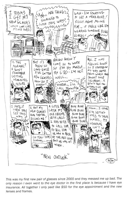 Gee, I go to all that “trouble” of opening the site up to zines, and now Steve decides to do an all-comic issue. Oh, and #27 is noticably missing at the moment (6/13/07) due to the general chaos of my apartment, but it’ll turn up sooner or later and I’ll add it to the page. Anyway, this is a journal comic from 9/16 to 10/11 of last year, in case you can’t read the scan. Steve deals with a long distance “sort of” girlfriend, sort of falls for an internet friend he finally meets in person, sells t-shirts at an outdoor art festival, gets drunk, bitches about the other shift not being productive at his job, and deals with getting new glasses, among other things. It’s an entertaining enough journal comic, if unbelievably sloppy at times. Well, almost all the time. Steve fesses up in the intro to doing these all in pen, in a sketchbook and mostly meaning them to be seen only by himself. He’s done, by his count, 1800-1900 of these comics by now and he’s just now decided that he wants some of them to be in his zine. He also says he’s chopped out the more boring and bitchy strips, so kudos to him for that. Not everything done in a journal comic is really worth seeing, and it’s great that he gets that. He was also going to go back and patch up the general sloppiness but wanted it to be unedited, as it was written. I think it would have been fine to at least make the lettering legible in some cases, but what do I know. Overall an entertaining issue, unless you’re a neat freak and/or really can’t stand journal comics. $3