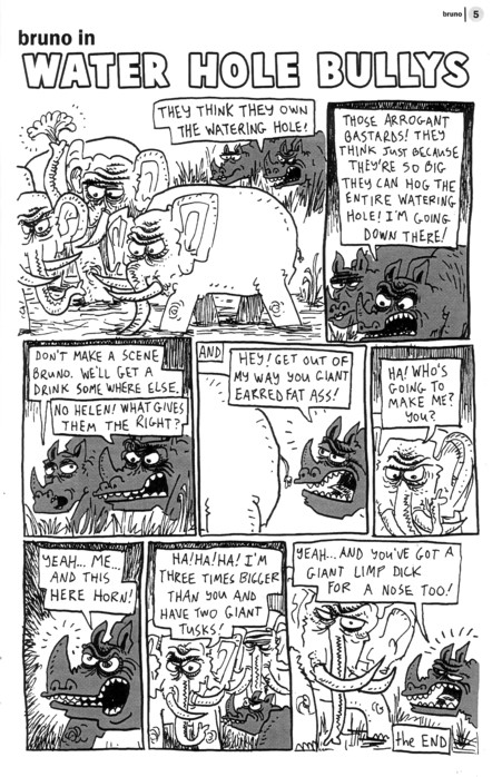 The haphazard reviewing of these issues continues, but in the grand scheme of things all these numerical holes will be filled anyway, so why be all neurotic about it now? This is another issue that’s almost all comics (except for a delightful text piece about how to catch a Bigfoot), which is great news to me, as his art is pretty damned good when it’s not trapped in a rushed, journal comic format. The story running through this issue in small chunks is Lizard Love, dealing with two roommates learning to love their new pet lizard. It helps that the reluctant roommate runs into a pretty girl outside walking her lizard, but this story is as close as I’ve seen this series get yet to sweet. Also here in here are comics about the thoughts of goons, the obvious fact that your boss is a creepy alien who secretly eats people, an angry rhino in couple’s therapy, cavemen inventions, a snooty artist trying to pay for coffee with a sketch, Crocodile Man drinking and signing a birthday card at work, and a mostly useless piece with a couple of explorers that is saved by the wonderfulness of their moustaches. Good stuff again, and the sheer consistency with which these issues are released continues to impress me. $3