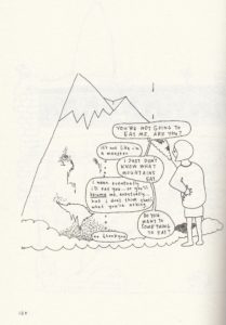 Sometimes picking the sample image is the trickiest part of writing a review, especially in a book like this where everything unfolds at a deliberate pace and no single image can really capture its essence. Not that that’s usually an option, but it’s hopeless with this book. Unless you believe that this book is about a woman and her talking mountain, and hey, maybe it is about that! It’s also about so much more, as it’s the rarest of fictional treats: I was reluctant to leave this strange, haunting, depressing, enlivening, fantastical world. This book is a collection of moments in the life of Edith May, who is also a superhero who has the power to fix everything that is wrong with the world, but she suffers from a crippling case of ennui so she never quite gets around to saving the world. She splits from herself to become this hero after her mother dies, leaving a lingering sense of loss throughout the story. From there we learn about her quiet apartment and life, how she opens her home up to neighborhood weirdos, her getting a fish that was supposed to sing to her, her old fashioned stove and the one day when she forgot to light it right away, an impromptu trip to Alcatraz and her running into a ghost, the sentient mountain that just wanted to be a good roommate, what was causing the leaking from the ceiling and how that led to another roommate/sidekick, trying to fit in with people while attending a bachelorette party, doing the same thing while attending an office Christmas party, her job as somebody who listened to people complain about their Christmas lights, and her final struggle against Death. Sort of. Oh, and how could I forget the moths? The moths were crucial to everything else. I could talk about this book for hours, but my instinct is to (digitally) hold it up in front of me, say “take some time to read this amazing book,” and leave it at that. For what it’s worth, I’ve read a lot of comics by a lot of different people about a lot of different subjects over the 20+ years I’ve been enjoying the small press comics world, and I’ve never read anything quite like this. If I was rich I’d offer a money back guarantee, but I’m not, so… take a chance on this book. You won’t be disappointed. $20
