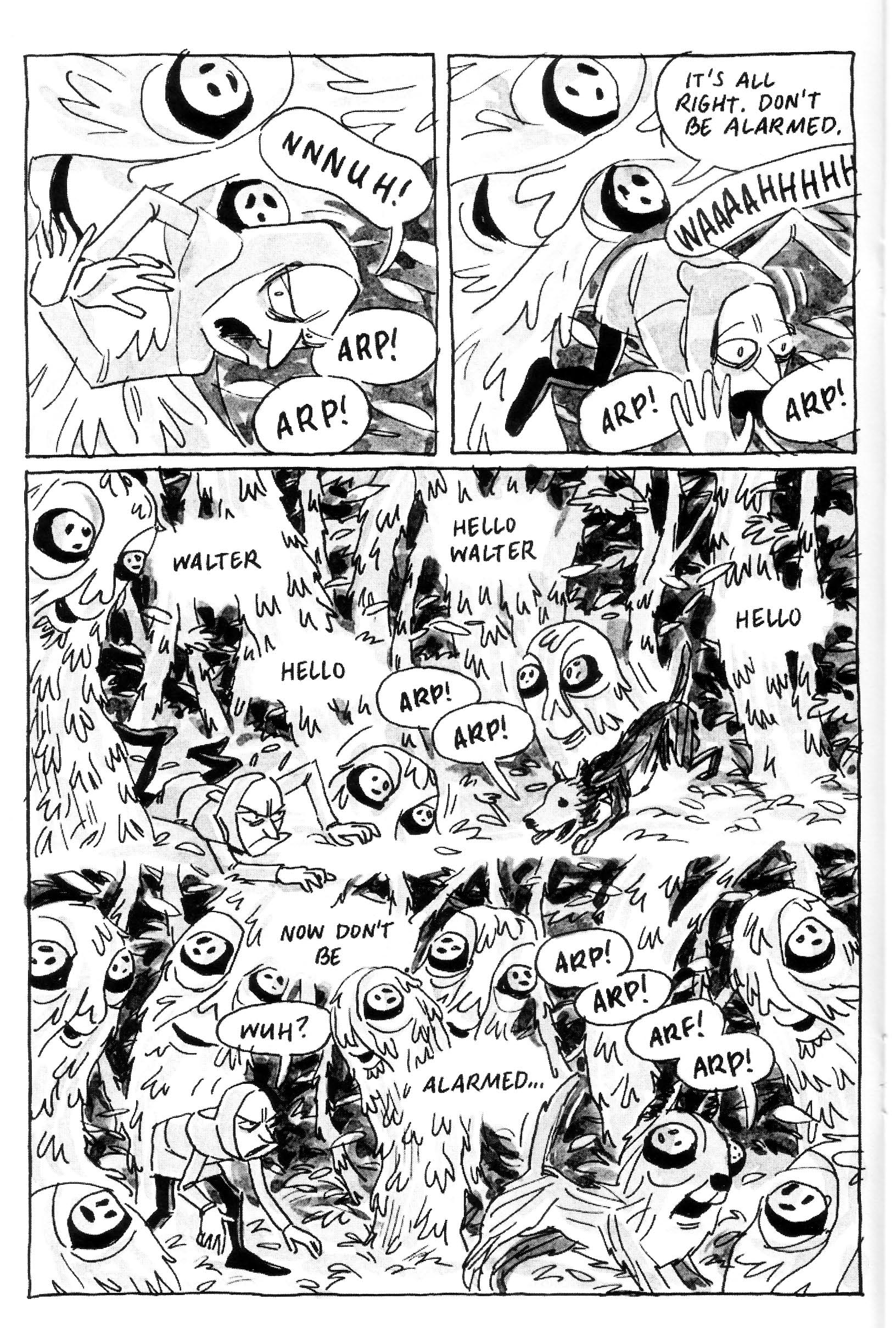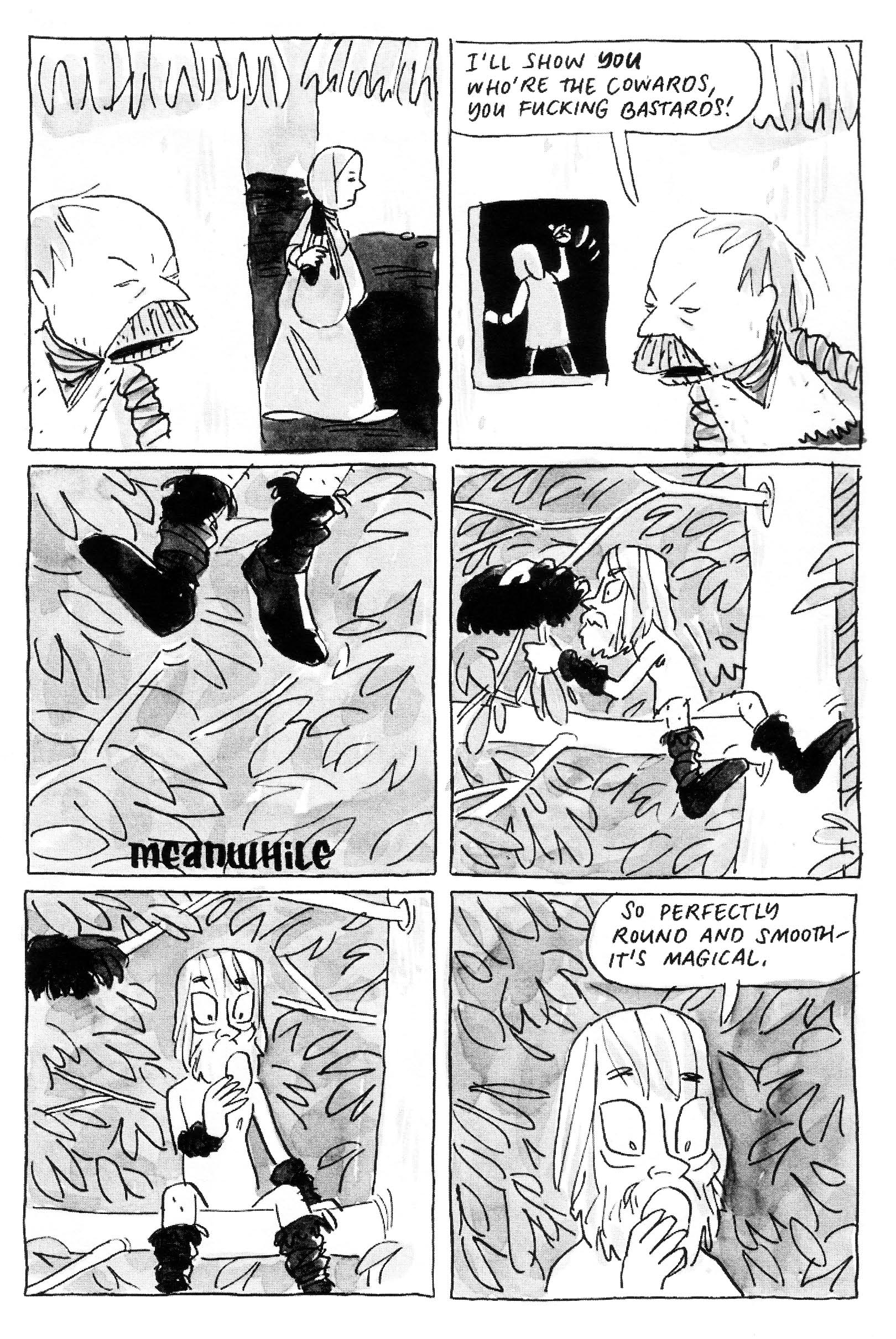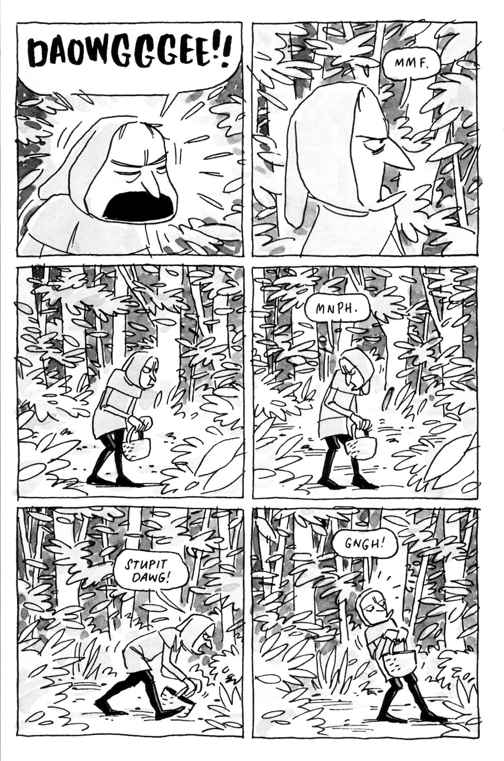 We’re back to the characters from the first issue this time around, as Damien’s master plan starts coming more into focus. Well, just barely, but I am going with the theory that he has a master plan at work. He even changed the outfits of the bandits from the end of the last issue (he will send you a copy of #2 with the altered outfits if you’re that neurotic about it, although he used a nicer word) because that fits in with his plan for the whole series, and I’m all for that level of foresight. The hermit from the last issue doesn’t make an appearance, but we do learn that Edith (last seen having sex with Reeve in the first issue) is accused of being a witch, Walter is still wandering around the forest talking to himself (although this time he appears to be on mushrooms), and the bandits are essentially 12 year old boys who fight amongst themselves for little reason. The only trouble with a series like this is that it’s hard to build up a complex story when it’s only coming out once or twice a year, but I’m not sure what the alternative is. Somebody like Bill Gates could come out as a fan of small press comics and give everybody who ever made a mini comic $10,000, but that seems sadly unlikely. So we just have to be content with the occasional blasts of brilliance like this, with a creepy and somehow childlike man getting hugged by trees, a man who cheated on his wife trying desperately to convince what is almost an angry mob not to jump to hasty conclusions about a supposed witch, and bandits with a new set of clothes for what I’m sure is a perfectly reasonable reason in the mind of the author. $4