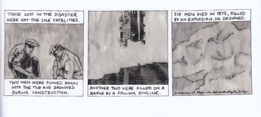 Is this David’s first comic that’s only about a single subject (not including comics about dreams)? Probably not but I’ve forgotten the other ones because my memory is crap. If only there was some way to check, like a global database of everything that’s ever happened. This one is based off a historical tragedy, so you can Google some images if you’d like after reading it. I know I did! David does a nice job of laying out the history, getting the reader familiar with the architect, listing the theories behind the collapse (he says that nobody knows for sure, although Wikipedia thinks that mystery is settled), showing the construction, etc. There were several warning as the bridge was being constructed, which led to quite a few people who were able to use the “I told you so” defense. The architect behind the bridge didn’t live long at all after its collapse; it seemed to destroy whatever will to live the man had left. The bridge became the only consistent means of travel across the river, as the ferry service was shut down after a few successful train crossings. Things seemed to run fine for about six months, but when it gave out, it gave out in brutal fashion. I do like the idea that the pillars have never been removed and still remain next to the current bridge. It’s a nice memorial to the people who died as well as being a monument to checking your work, I guess? David also includes some poems and tributes to the incident that came out shortly after it happened, including some poems from the man who was thought to be the worst poet in the world at the time. It’s a fascinating story all around, even if it’s lacking in some definitive answers. Not that that’s David’s fault, it’s just that historians can’t seem to agree. No price listed, but probably around $10ish (check with David through his website)