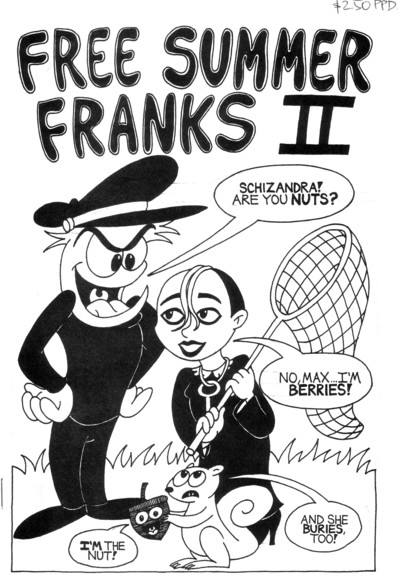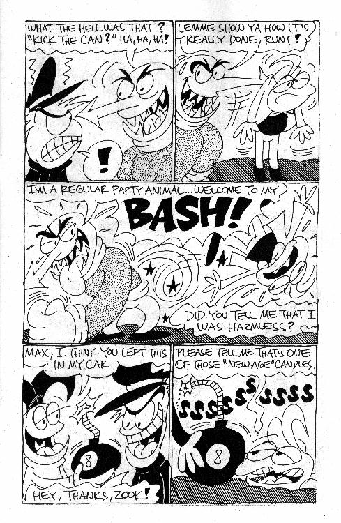 It might just be my imagination, but I think this one is much bigger than the first one. If it’s not, maybe it just seems that way because not a page goes by without some serious destruction and hijinx, which is fine with me. I mostly think you’re better off going into this book blind and having all the random stuff just smack you in the face, but it’s my duty to tell you what this is about, so if you’d rather be surprised, stop now, check out the contact info and go on your merry way. You’ve been warned! In here you’ll find 19 year old Coke bottles, clubbing, cannibal tuna, that one shark from that one old cartoon (you’d know it if you saw it), talking horns, a great neck, and a pokemon battle. Riveting drama it ain’t, but it’s funny, so what more can you ask? $2.50 PPD!