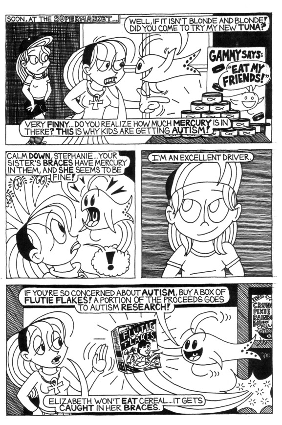 It’s says a lot that Tim can take a subject like autism and still make it funny. Granted, this is a serious comic; the cover isn’t lying about that. He just does an excellent job with the little moments that make up this book. Chances are that unless you have a family member with autism (or the family member of a close friend), you don’t know a whole lot more about this than I did. And this isn’t meant to be the authoritative book on autism by any means. Still, I learned plenty from this mini. In here Tim tells stories about his daughter’s eating habits at McDonalds (ice cream with sprinkles and fries), how she needs time to warm up to people before she gets at all comfortable around them, how the sound made by most lights bothers her, how he must give the exact correct answer to a question, his joy in seeing her enjoy little things or being the one to say things without prompting, maintaining the rituals, and trying to keep her from getting to frustrated at the world. It also documents a damned fine bit of parenting, although I don’t think that Tim had that in mind. If you have any interest in this subject and/or maybe want something you can show kids to help explain autism, this is an excellent place to start. I was also happy to see that Tim is still going strong (this is from 2005 but I haven’t reviewed any of his comics in ages) and has plenty of new comics up at his website. $1