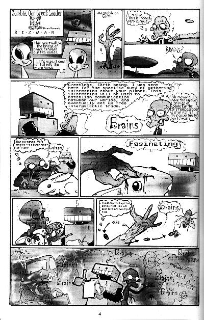 “Bizmar” stands for Bunny Insect Zombie Monkey Alien Robot, and the idea here seems to be to cram in all six things into a two page comic, making this the best idea for an anthology in the history of anthologies. Some names you might recognize from this site: Ben Snakepit, Tod Parkhill, Tom Manning, Stan Yan, George Tautkus, and Brian Morante. There are more people here (check out the website for ordering info and the complete list), but I want to talk about the comics! There’s a wide and completely absurd collection of stories, including all six things working in a pizza shop, a zombie becoming president, Ben going to see Gwar (yes, he does manage to fit everything in), A giant robot that is made up of 5 smaller pieces ala Voltron, renting movies for Halloween, bizarre sex confessions, a surprise party for a zombie, and even more stuff that I’m not going to ruin for you. Look, this is a brilliant idea that’s pulled off to perfection. What more do you want? $3!