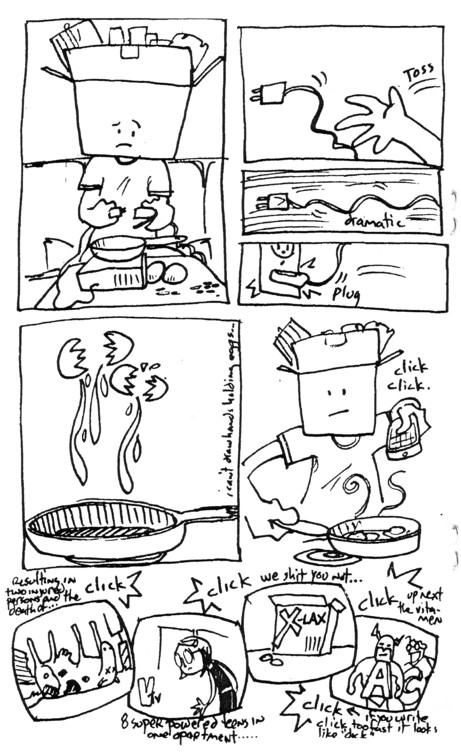 This is a tiny one. It’s all about a guy with a box with a head who sees the “this is your brain on drugs” commercial and is immediately hungry for eggs. The twist is that he also throws in some self-deprecating comments when the situation warrants, like when he can’t draw hands cracking eggs or is obviously having trouble coming up with an ending. It’s only 8 pages so it’s hard to say too much about it, but it’s a fun little book. $.50 maybe? Either that or a dollar, check the contact info on the page and find out, although I’d pick some of his other books first…