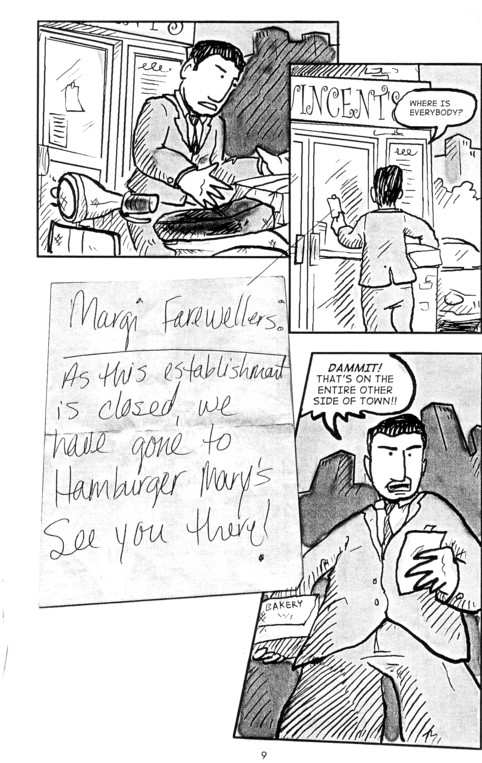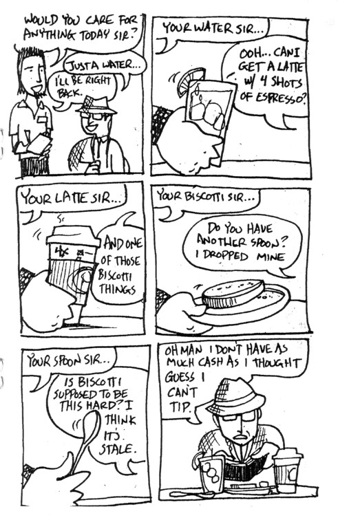 Speaking as somebody who still stops to pick up random pieces of paper laying on the ground, I have to say that this is the best concept for a 24 hour comic that I’ve seen yet. Tod took litlte scraps of paper that he found and jammed them together into a rambling yet still cohesive story. There’s a man named Russ who starts off at work and has to deal with annoying parking people, crazed letters from his mother, angry notes from an ex-girlfriend and other random tidbits. More good stuff from Tod, which shouldn’t come as much of a surprise to anybody at this point. Contact info is up there, this is $2.