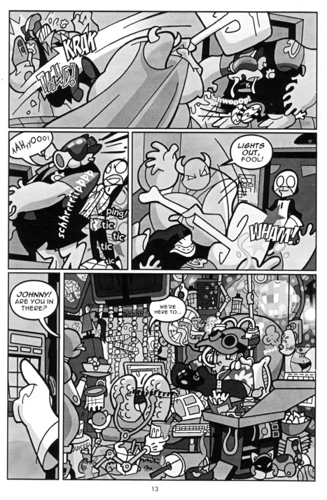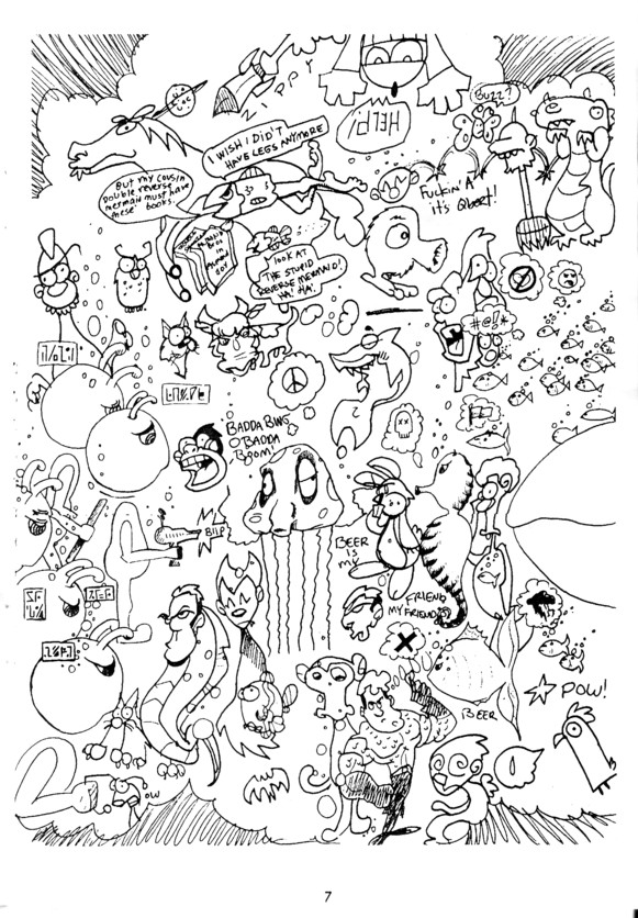 You know, I meant to keep reading these thing weekly so I would retain some semblance of a plot, but it got away from me somehow and here I am, a couple of months later, and I once again have no idea what’s going on here. Why don’t I just tell you what you can find in this comic? If you read this you’ll see a bimbo with her hand super-glued to her hip, a two-headed dog cut in half, a fatal sneeze, a serial killer of mimes, a fish with legs, and doom. All kinds of funny nonsense going on, start to finish, but it’s hard to recommend if you want something coherent. If coherent is a second concern to funny, well, go for it. I still plan on reading them all in a row when I get to #5, so maybe it’ll all be clearer then. Contact info is up there, this is a buck…