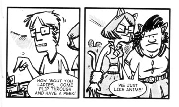 Here’s another one of those tiny Jack Chick-like comics, another cheapie at only $.25. This one is all about setting up the Young American Comics table, being full of hope at the prospects of having many people discover their comics… only to find that almost everybody who’s at the convention is there either for the pornstars, anime, or to buy action figures. It’s a cautionary tale, I guess, and, after all, WHAT WOULD YOU DO? If you were confronted with spending your last $5 on pornstars and action figures or some independent comics you’d never heard of. Contact info is up there, they have more great comics than I can count on both hands there, which is always a good sign…