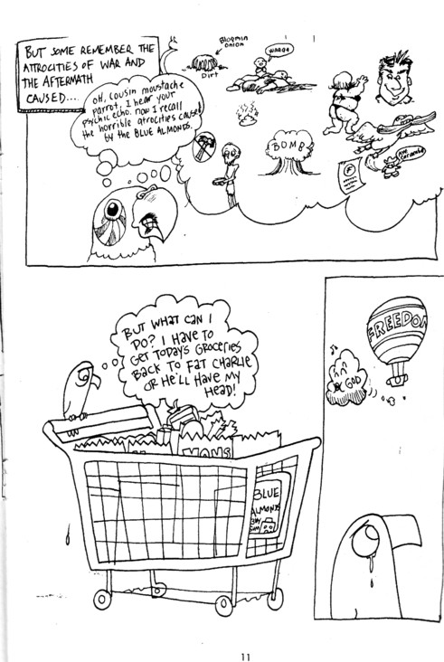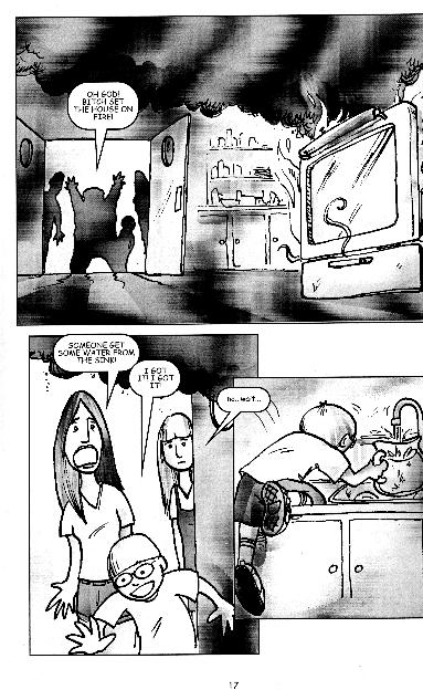If there has ever been a review-proof comic, this is it. You see, this is a story by a bunch of artists from Young American Comics (Parkhill, Bush, Mason, Briedis, Morante and Hunt are listed but there could be more) that’s done in as random of a manner of possible. Different people pick up after reading a panel or two from somebody else, with no idea of where the story is going, and make up something new. It’s passed around until its done, and it’s a five issue series, so it’s hard to say if anything here is going to work out in the long term. In the short term, it’s off to a good start. In here are Miss Cleo, God, an angry flower, a shadowy figure, poo, blue almonds, war, a parrot, and a fat man. In case you were wondering, no, it doesn’t make a lot of sense yet, and it might not ever, but it’s a great idea for an experiment and I’m curious to see where it goes. Taken as one issue, it’s funny, but that’s all that I can really say about it so far. $1, contact info up there!