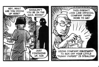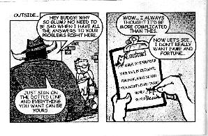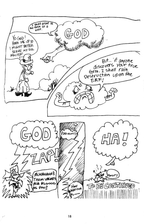 Another tiny one in the Jack Chick style, and I had to check this page to make sure I wasn’t reviewing something I had already done, but sure enough, they’re two separate things. This one is more of a “what if” story, as Tod wishes in a moment of rage about his lot in life that he had never started drawing comics. He wakes up as a married full time employee working in a corporation, when eventually he runs across another employee making illegal copies at work, and I can’t describe any more or I’ll run out of comic. It’s funny, $.25, and worth a look. Contact info is scattered around, I’m sure you can find it.