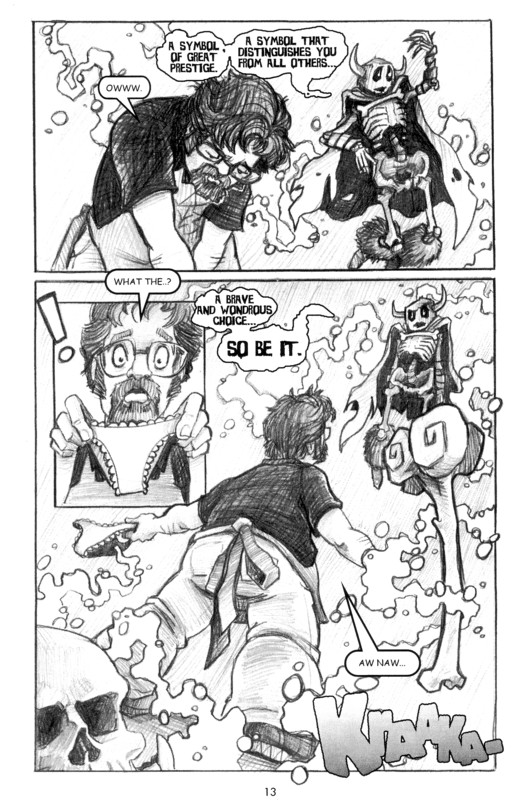 Everybody out that run into one of those Jack Chick religious comics by now, right? If not, you might want to skip this comic. If you have, this book is a great parody. It’s basically just Tod wandering around, trying to figure out why nobody buys independent comics. He’s eventually offered fame and fortune if he sells his soul, and hilarity ensues. Honestly, this book is too tiny to say much about. It was entertaining, and if that cover makes you nostalgic for those crappy Jack Chick comics, then it’s probably only $1. Contact info is up there…